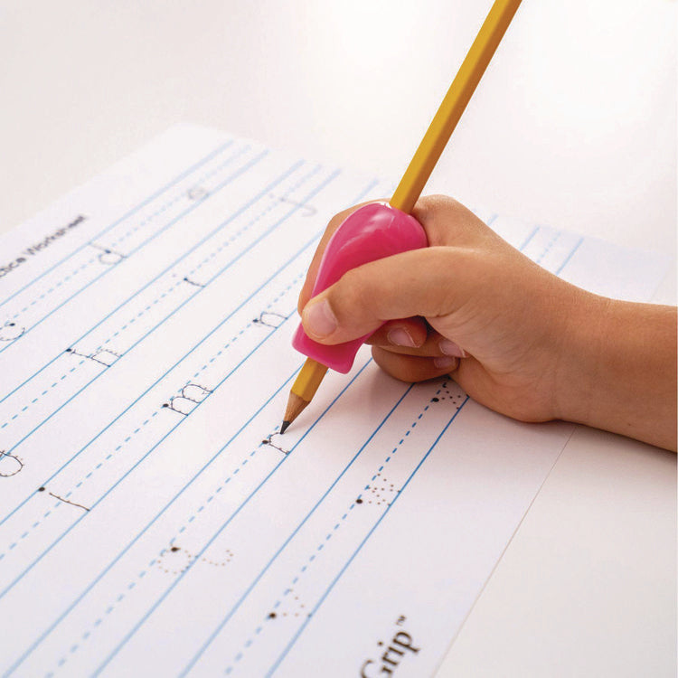 The Jumbo Grip helps improve comfort, control, and the quality of handwriting. It uses the proven design of The Pencil Grip and is 40% larger. The large size of the grip means it provides more support, up to the second knuckle. Unlike other large pencil grips, the jumbo grip feels natural because of its ergonomic design and soft, flexible, latex-free material. The unique shape gently encourages the fingers and hand to rest in the proper position for grippingThe Tripod Grip. The Jumbo Grip was designed by a doctor and is widely used in classrooms, at home, and in therapeutic settings. The unique shape is designed to be "one size fits all" to help the hands of kids and adults, and work for both righties and lefties. The grip can be used as a training tool or used permanently for added support. It fits on pencils, primary pencils, pens, crayons, markers, paint brushes and more so its benefits can be widely enjoyed. Material(s): Custom Blended Polymer; Color(s): Assorted; Length: 1"; Color Assortment: Dark Blue; Green; Light Blue; Orange; Pink; Red; Yellow.