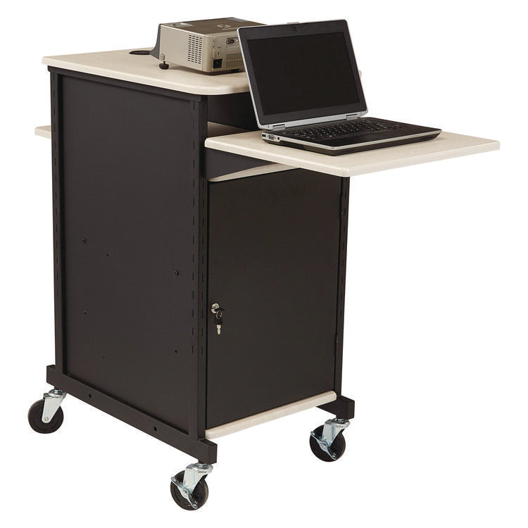 The new PRC400 Jumbo Presentation Cart is a multifunctional, robust cart with ample storage and display space for audio-visual equipment like laptops, projectors and document cameras. The extra-large work surface and optional broad, adjustable side shelf make for easy set-up for all presentations with easy access to your equipment. Safely protect all of your valuable AV devices in the spacious locking storage cabinet with an adjustable (or removable) middle shelf. Constructed of an 18-gauge steel frame with an attractive woodgrain finish. Enjoy smooth mobility on 4" heavy-duty casters (two locking.) Wire management and grommets included to help simplify your presentations. Color(s): Ivory/Black; Color Family: Black; Wired/Wireless: Wireless; Caster/Glide/Wheel: Four 4'' Casters, Two Locking.