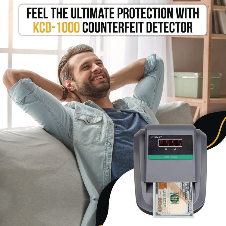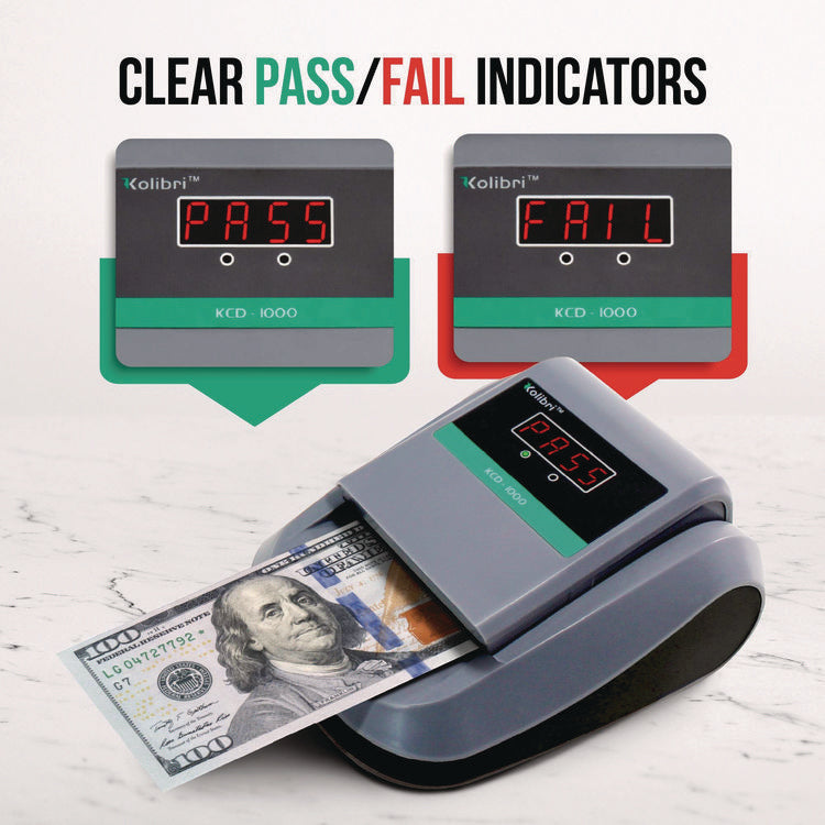 Ensure only genuine currency goes into your till with the KCD-1000 Counterfeit Detector. Featuring advanced ultraviolet, magnetic, infrared, dimensional and thickness systems as well as chain-note, half-note and double-note detection, it can catch various counterfeiting techniques and currency discrepancies. Simply insert a bill in any of the four possible orientations; and in as little as half a second, its illuminated red display indicates whether the bill gets a "pass" as legal tender or a "fail". Accurate, quick and efficient with a compact, lightweight, battery-powered design, the KCD-1000 is perfect for restaurants, night clubs, merchandise kiosks, vendor carts and trucks any point-of-sale scenario, whether its sharing space with a cash register or being carried by hand. Wherever you need a quick and easy, accurate way to check the legitimacy of the currency you receive, this device can save you time and money. Counterfeit Bill Detector Type: Dimensional; Infrared Reflection (IR); Infrared Transmision (Image); Magnetic Ink (MG); Magnetic Thread (MT); Thickness; Ultraviolet (UV); Watermark; Currency: US; Color(s): Gray; Width: 5.1".