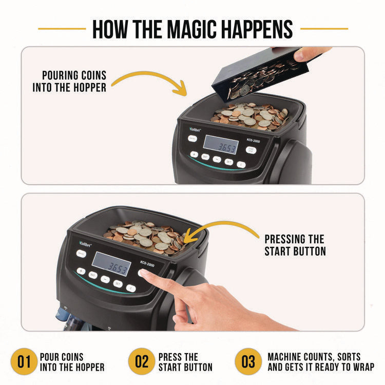 Facilitate accounting in your home or business by organizing USD coins with the Kolibri KCS-2,000 coin counter and sorter machine. Versatile in functionality, the device comes with bins for sorting and coin tubes for easy batching into preformed wrappers. With this professional coin sorter's one-touch tube batch setting technology, place the wrapper into the tube, press and hold the "+" sign, then press "Start" and watch the tubes fill up and stop when the roll is complete. Customize your batch settings so you can use both the coin trays and tubes simultaneously, so some denominations come in roll form and others fill the bins loosely. This currency-handling machine counts up to 220 coins per minute, which saves time over counting manually. Check your coin-counting progress on the easy-to-read LED screen, which shows the total number of coins as the machine counts them by denomination. Compact, with a handle for easy portability. Cash/Coin Counter Type: Coin Sorter/Counter; Denomination: Dimes; Dollar Coins; Nickels; Pennies; Quarters; Bill/Coin Capacity: 2,000; Counting/Sorting Speed: 300 Coins/min.