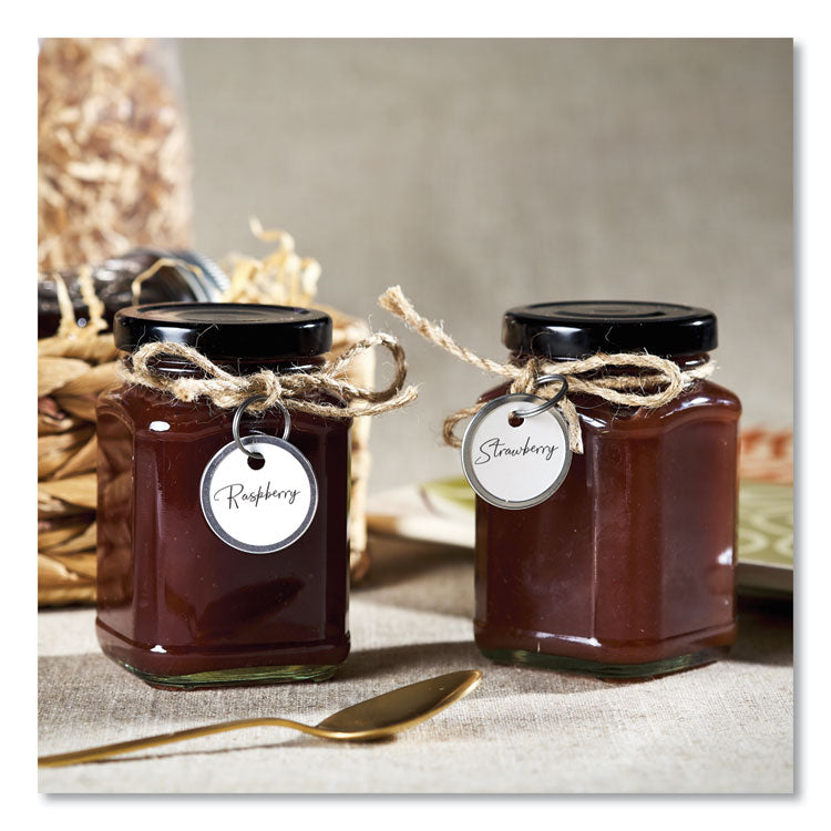 Hunting in vain for the key that fits a particular lock becomes a thing of the past with these easy-to-use Key Tags. Each tag features a split ring that slides easily onto your key for fast, convenient organization. A metal rim around the round tag aids in stability and durability for frequent handling. Inscribe your notes on white or colored tags for a clear, easily readable method of quick identification of each key's purpose. Whether you're juggling keys for automobiles, real estate or something else, these tags will help provide the key to increased efficiency. Size: 1.25 dia; Color(s): White; Material(s): Card Stock; Metal; Fastener: Metal Key Ring.