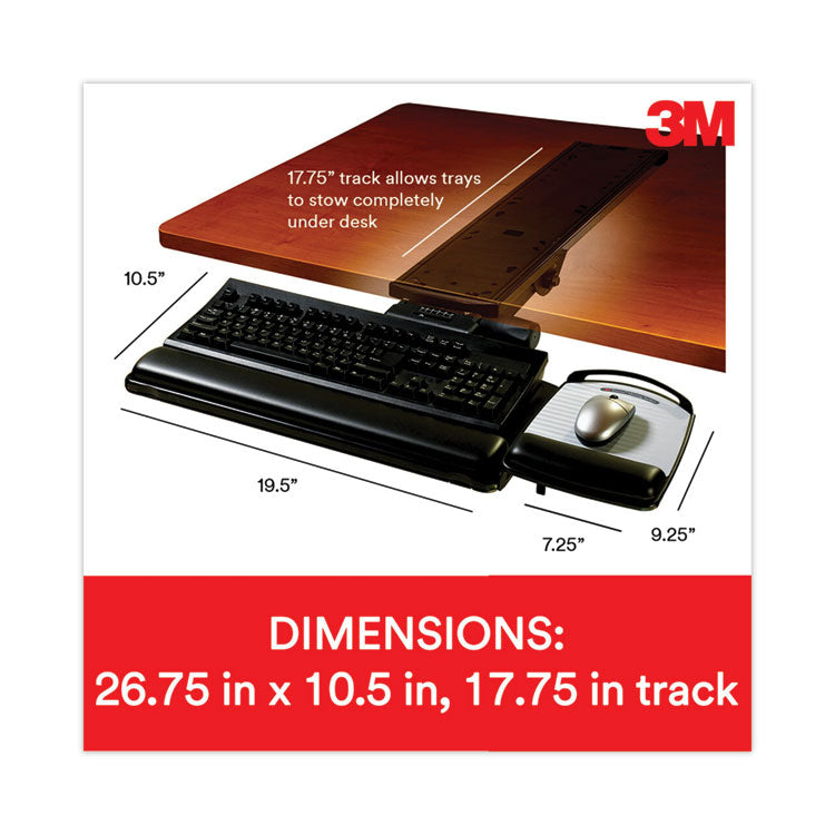 Highly adjustable keyboard tray features lateral adjustment, 5 1/2" height range, 360° swivel and +15°/-15° tilt. Easy height and tilt adjustment; just loosen knob, position tray as desired, then re-tighten knob. Independent articulating mouse platform can be mounted right or left. It's perfect for shallow workstations where mounting depth is at least 17 1/2". Leatherette gel wrist rests with antimicrobial product protection. Precise™ mousing surface extends battery life. Workstation Type: Straight; Sit-to-Stand Option: No; Weight Capacity: 70 lb; Height (+/- Desktop): +1.5" Above to -4.5" Below.
