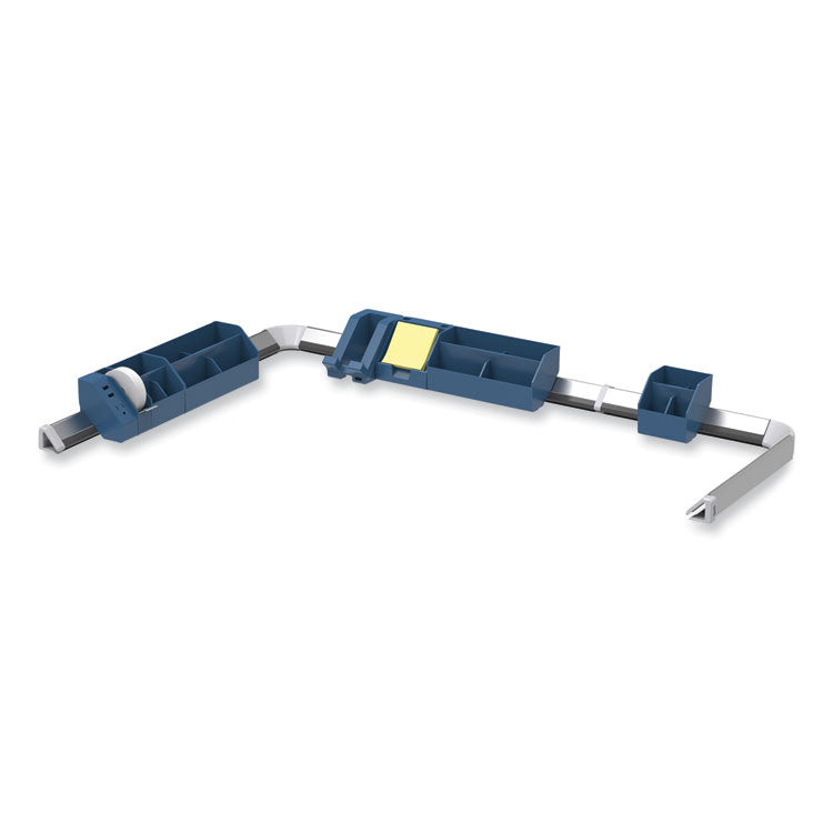 Use this 17-piece Konnect™ office organizer kit to give your office a makeover and do away with all that distracting clutter. It all starts with the cord management rails. This kit comes with two long and short rails that you can connect together using the corner connectors and extenders. Dock all your connect products to the rail also for zero movement. Tuck messy wires into the rail to automatically clear your desktop of excess. You also get two wide and short storage bins that hold all sorts of items. Have loose pencils lying around everything? Place them into one of the storage and pencil holders so they're safely concealed in a single location. Each bin comes with modular dividers and removable lids for further organization. Everyone needs tape at their desk. The tape dispenser is super compact and has an easy-cutting blade. Plus, it includes a single roll of office tape. The card holder is unique as it holds business cards and sticky notes, and comes with a yellow sticky note pad to start you off. Time to charge up! The phone dock provides a resting spot for your phone while charging it with the USB port. Desktop Supplies Organizer Type: Multipurpose; Number of Compartments: 17; Overall Width: 4.02"; Overall Depth: 31.69".