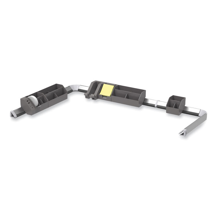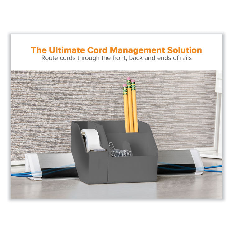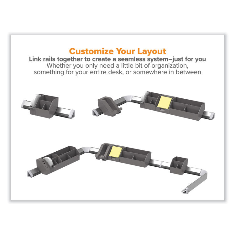 Use this 17-piece Konnect™ office organizer kit to give your office a makeover and do away with all that distracting clutter. It all starts with the cord management rails. This kit comes with two long and short rails that you can connect together using the corner connectors and extenders. Dock all your connect products to the rail also for zero movement. Tuck messy wires into the rail to automatically clear your desktop of excess. You also get two wide and short storage bins that hold all sorts of items. Have loose pencils lying around everything? Place them into one of the storage and pencil holders so they're safely concealed in a single location. Each bin comes with modular dividers and removable lids for further organization. Everyone needs tape at their desk. The tape dispenser is super compact and has an easy-cutting blade. Plus, it includes a single roll of office tape. The card holder is unique as it holds business cards and sticky notes, and comes with a yellow sticky note pad to start you off. Time to charge up! The phone dock provides a resting spot for your phone while charging it with the USB port. Desktop Supplies Organizer Type: Multipurpose; Number of Compartments: 17; Overall Width: 4.02"; Overall Depth: 31.69".