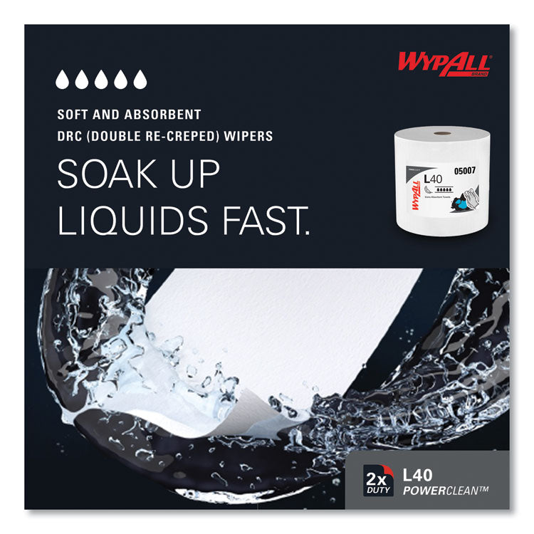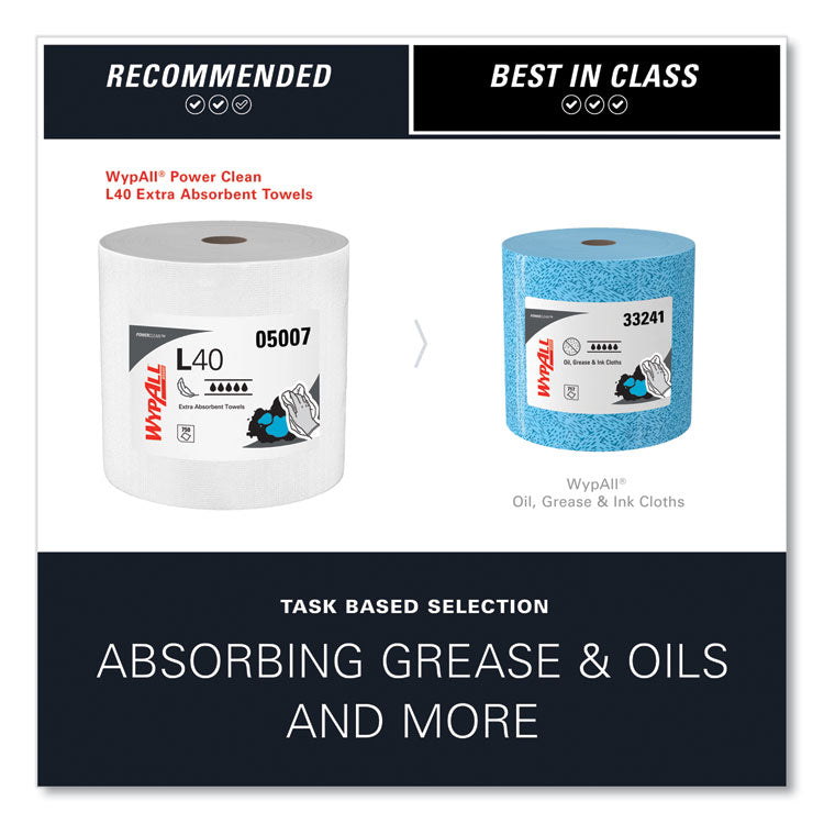 Regardless of your task, industry or budget, our WypAll® wipes, towels and cloths are designed to give you the durability, absorbency and versatility of a laundered cloth with the cost efficiency and hygiene of a disposable. Trust the WypAll* Brand, the one that sets the standard for excellence in wipers. WypAll* L40 Towels are effective wipers that absorb liquids lightning-fast. These towels are made of bonded cellulose using DRC (double re-creped) technology for strength, softness and absorbency. As a wiping towel, it soaks up liquids fast, but all you'll feel is softness, thanks to a plush, touchable outer layer. In fact, it's a popular choice for patient wiping in healthcare industries, for bathing and patient drying. These utility towels are specially designed to absorb liquids, lubricants and oils (in restaurants for wiping counters, in mechanic shops, industrial and commercial factories and more), yet they're soft enough for use on face and hands. Experience the difference in superior absorbency and cleaning at your home or office today! As we look towards the future, Kimberly-Clark Professional is committed to providing a wide collection of essential products and services that help make your workplace exceptional. Our dedication to innovation has helped businesses confidently navigate change and empowered people at work for nearly 150 years and we are committed to do so for years to come. Jumbo Roll. Towel/Wipe Type: Dry Wipes; Application: Hand Washing; Applicable Material: Hands; Face; Material(s): Paper.