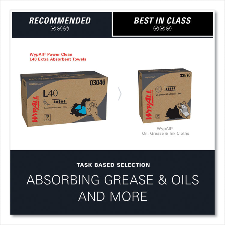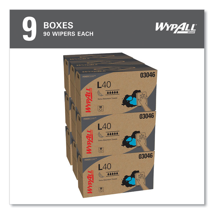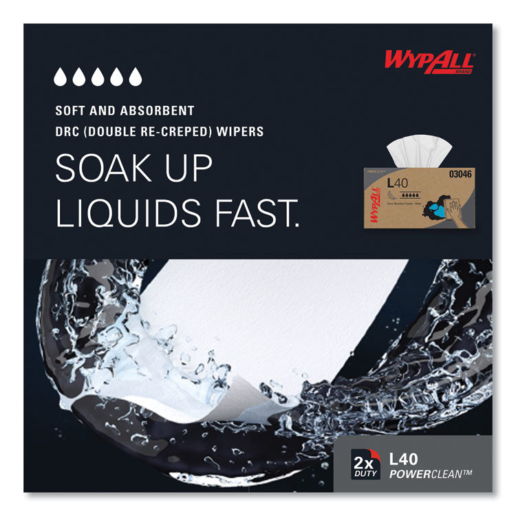 Regardless of your task, industry or budget, our WypAll® wipes, towels and cloths are designed to give you the durability, absorbency and versatility of a laundered cloth with the cost efficiency and hygiene of a disposable. Trust the WypAll* Brand, the one that sets the standard for excellence in wipers. WypAll* L40 Towels are effective wipers that absorb liquids lightning-fast. These towels are made of bonded cellulose using DRC (double re-creped) technology for strength, softness and absorbency. As a wiping towel, it soaks up liquids fast, but all you'll feel is softness, thanks to a plush, touchable outer layer. In fact, it's a popular choice for patient wiping in healthcare industries, for bathing and patient drying. These utility towels are specially designed to absorb liquids, lubricants and oils (in restaurants for wiping counters, in mechanic shops, industrial and commercial factories and more), yet they're soft enough for use on face and hands. Experience the difference in superior absorbency and cleaning at your home or office today! As we look towards the future, Kimberly-Clark Professional is committed to providing a wide collection of essential products and services that help make your workplace exceptional. Our dedication to innovation has helped businesses confidently navigate change and empowered people at work for nearly 150 years and we are committed to do so for years to come. Pop-Up* Box. Towel/Wipe Type: Dry Wipes; Application: General Purpose; Applicable Material: Metal; Stainless Steel; Material(s): Double Recrepe (DRC).
