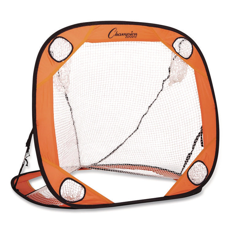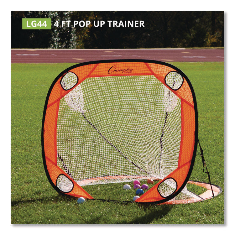 Made with heavy-duty mesh netting and nylon binding, the Champion Sports 4 ft Lacrosse Pop Up Target Trainer is designed to help players practice their shooting accuracy. With four mesh pockets in the corners, this lacrosse trainer gives players something to aim for while also rebounding balls back if they miss. Featuring a pop-up design and flat frame, this trainer can be stored flat for added convenience. Length: 4 ft; Width: 4 ft; Material(s): Mesh; Nylon; Fiberglass; Playground/Gymnasium Sets Type: Pop-Up Target Trainer.