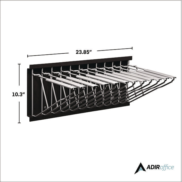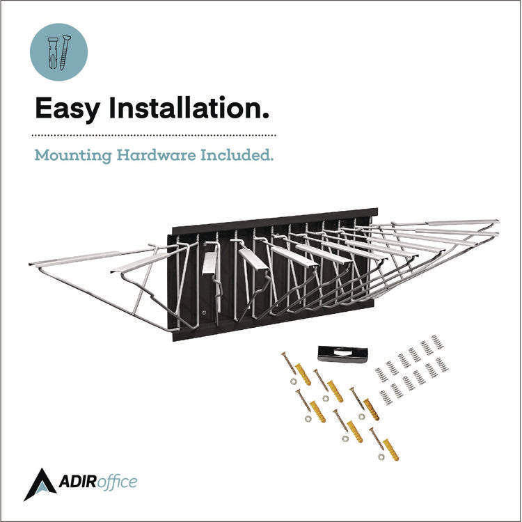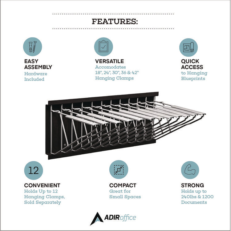 With the AdirOffice Pivot Wall Rack with Hangers, you get easy access to your blueprints, plan drawings, maps and other large documents. Keeping you organized in the office and making your work day more efficient, you can quickly retrieve any large-format file in no time flat. Hanging blueprint storage is no problem with Adir Corp. This vertical wall rack's 12 pivoting hangers swing wide and freely from side to side for easy access and viewing. Plus, you can fit a variety of clamp sizes onto the holder at once, each hanger will fit one paper clamp of any size. This blueprint wall rack is expertly crafted using solid steel to provide long-lasting strength and use for years to come. Furthermore, it's furnished in powder-coated finish that will easily fit into and enhance any interior space. You can quickly install the rack on any wall with the included mounting hardware. Please note: due to the 240 lb weight capacity, it would be best installed over a wall stud or solid surface. Once mounted, it allows for easy, convenient access to all of your stored documents. Color(s): Black; Rack Style: Blueprint Literature Rack Display; Mounting: Wall; Document Size Accommodation: Assorted.