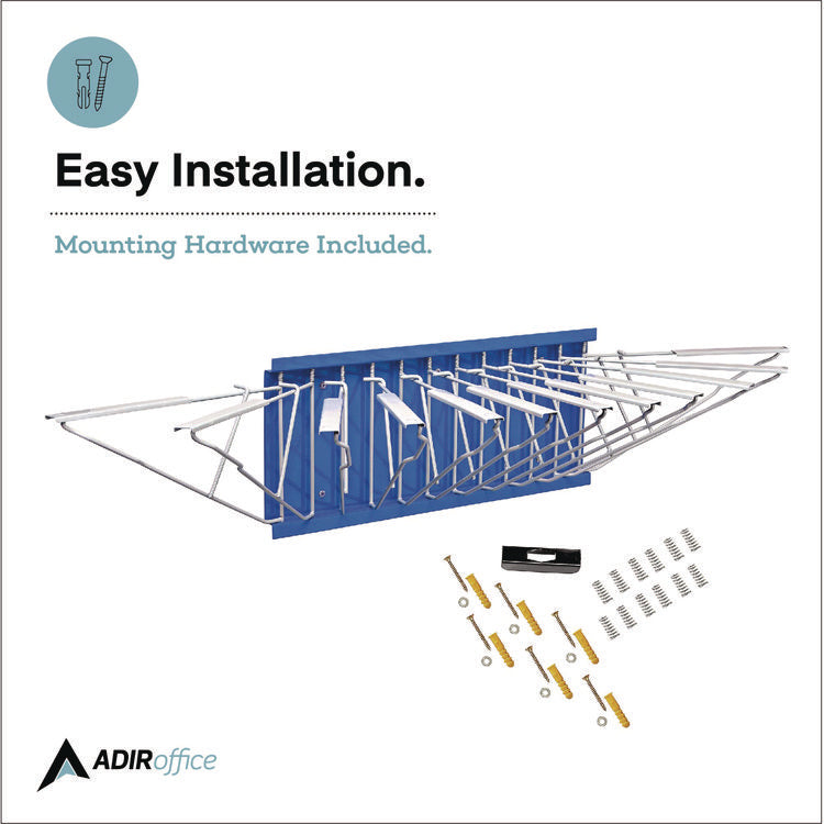 With the AdirOffice Pivot Wall Rack with Hangers, you get easy access to your blueprints, plan drawings, maps and other large documents. Keeping you organized in the office and making your work day more efficient, you can quickly retrieve any large-format file in no time flat. Hanging blueprint storage is no problem with Adir Corp. This vertical wall rack's 12 pivoting hangers swing wide and freely from side to side for easy access and viewing. Plus, you can fit a variety of clamp sizes onto the holder at once, each hanger will fit one paper clamp of any size. This blueprint wall rack is expertly crafted using solid steel to provide long-lasting strength and use for years to come. Furthermore, it's furnished in powder-coated finish that will easily fit into and enhance any interior space. You can quickly install the rack on any wall with the included mounting hardware. Please note: due to the 240 lb weight capacity, it would be best installed over a wall stud or solid surface. Once mounted, it allows for easy, convenient access to all of your stored documents. Color(s): Blue; Rack Style: Blueprint Literature Rack Display; Mounting: Wall; Document Size Accommodation: Assorted.