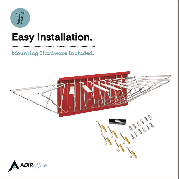 With the AdirOffice Pivot Wall Rack with Hangers, you get easy access to your blueprints, plan drawings, maps and other large documents. Keeping you organized in the office and making your work day more efficient, you can quickly retrieve any large-format file in no time flat. Hanging blueprint storage is no problem with Adir Corp. This vertical wall rack's 12 pivoting hangers swing wide and freely from side to side for easy access and viewing. Plus, you can fit a variety of clamp sizes onto the holder at once, each hanger will fit one paper clamp of any size. This blueprint wall rack is expertly crafted using solid steel to provide long-lasting strength and use for years to come. Furthermore, it's furnished in powder-coated finish that will easily fit into and enhance any interior space. You can quickly install the rack on any wall with the included mounting hardware. Please note: due to the 240 lb weight capacity, it would be best installed over a wall stud or solid surface. Once mounted, it allows for easy, convenient access to all of your stored documents. Color(s): Red; Rack Style: Blueprint Literature Rack Display; Mounting: Wall; Document Size Accommodation: Assorted.