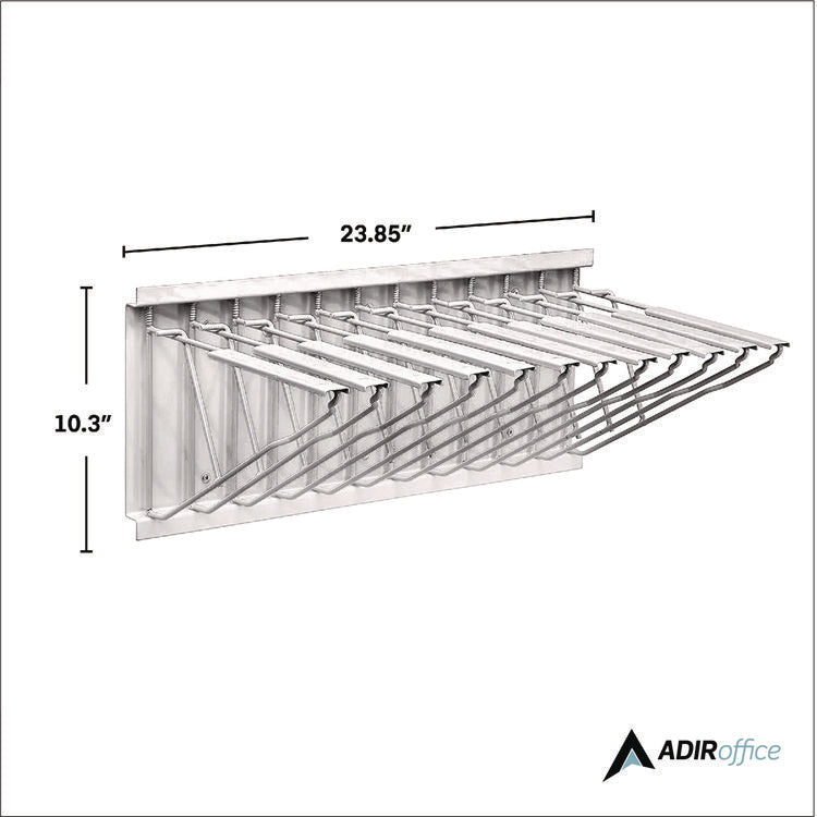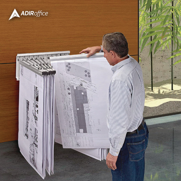 With the AdirOffice Pivot Wall Rack with Hangers, you get easy access to your blueprints, plan drawings, maps and other large documents. Keeping you organized in the office and making your work day more efficient, you can quickly retrieve any large-format file in no time flat. Hanging blueprint storage is no problem with Adir Corp. This vertical wall rack's 12 pivoting hangers swing wide and freely from side to side for easy access and viewing. Plus, you can fit a variety of clamp sizes onto the holder at once, each hanger will fit one paper clamp of any size. This blueprint wall rack is expertly crafted using solid steel to provide long-lasting strength and use for years to come. Furthermore, it's furnished in powder-coated finish that will easily fit into and enhance any interior space. You can quickly install the rack on any wall with the included mounting hardware. Please note: due to the 240 lb weight capacity, it would be best installed over a wall stud or solid surface. Once mounted, it allows for easy, convenient access to all of your stored documents. Color(s): White; Rack Style: Blueprint Literature Rack Display; Mounting: Wall; Document Size Accommodation: Assorted.