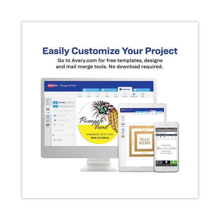 Make sure your handmade gifts and products stand out with Avery labels that offers the professional finishing touch you need. The print-to-the-edge capability allows you to create bright, eye-catching full-bleed labels with sharp text and crisp images printed right to the edge of the stickers with no border or margin. Sure Feed technology helps deliver a more reliable feed through your printer to prevent print misalignments and paper jams. These printable stickers are quick and easy to apply with the patented Easy Peel label sheets with Pop-up Edge. Simply fold the sheet back to display the label edges for convenient and fast peeling that saves time and avoids label waste. Compatible with both laser and inkjet printers to provide crisp and vivid prints. Avery Design & Print makes it easy to create customized labels from your own home or business. The free browser-based software has everything you need to design gift labels, soap labels, thank you stickers, round stickers for kids, party favor labels, and more. Try it out today. Shape: Oval; Label Size - text: 1.5 x 2.5; Label Color(s): White; Color Family: White.