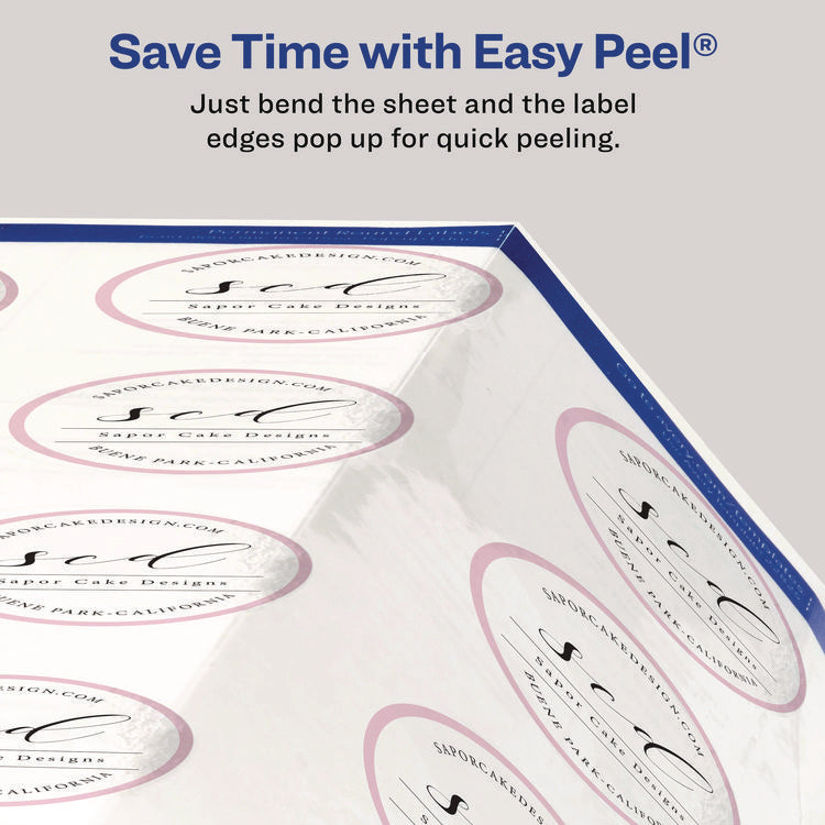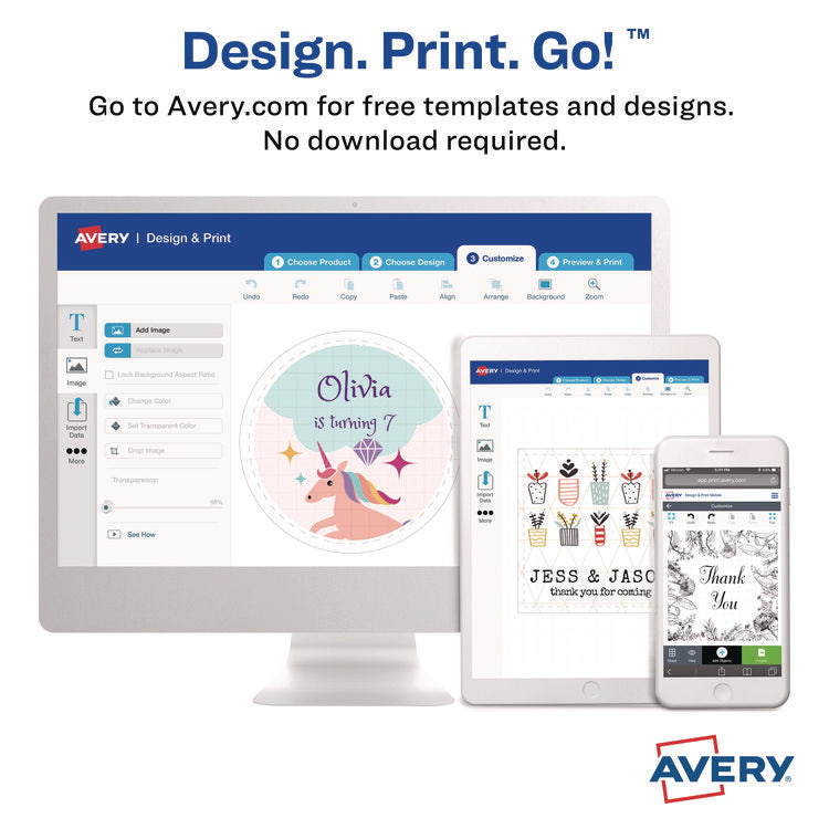 Make sure your handmade gifts and products stand out with Avery labels that offers the professional finishing touch you need. The print-to-the-edge capability allows you to create bright, eye-catching full-bleed labels with sharp text and crisp images printed right to the edge of the stickers with no border or margin. Sure Feed technology helps deliver a more reliable feed through your printer to prevent print misalignments and paper jams. These printable stickers are quick and easy to apply with the patented Easy Peel label sheets with Pop-up Edge. Simply fold the sheet back to display the label edges for convenient and fast peeling that saves time and avoids label waste. Compatible with both laser and inkjet printers to provide crisp and vivid prints. Avery Design & Print makes it easy to create customized labels from your own home or business. The free browser-based software has everything you need to design gift labels, soap labels, thank you stickers, round stickers for kids, party favor labels, and more. Try it out today. Shape: Round; Label Size - text: 2.5"; Label Color(s): White; Color Family: White.