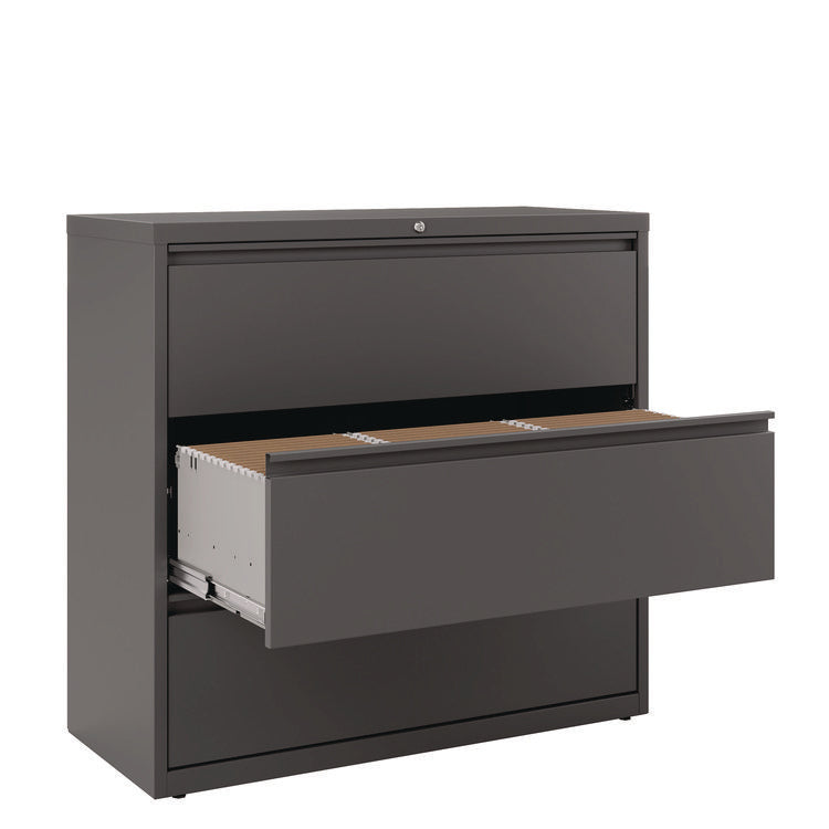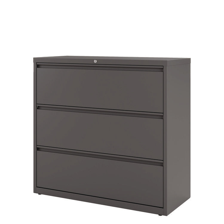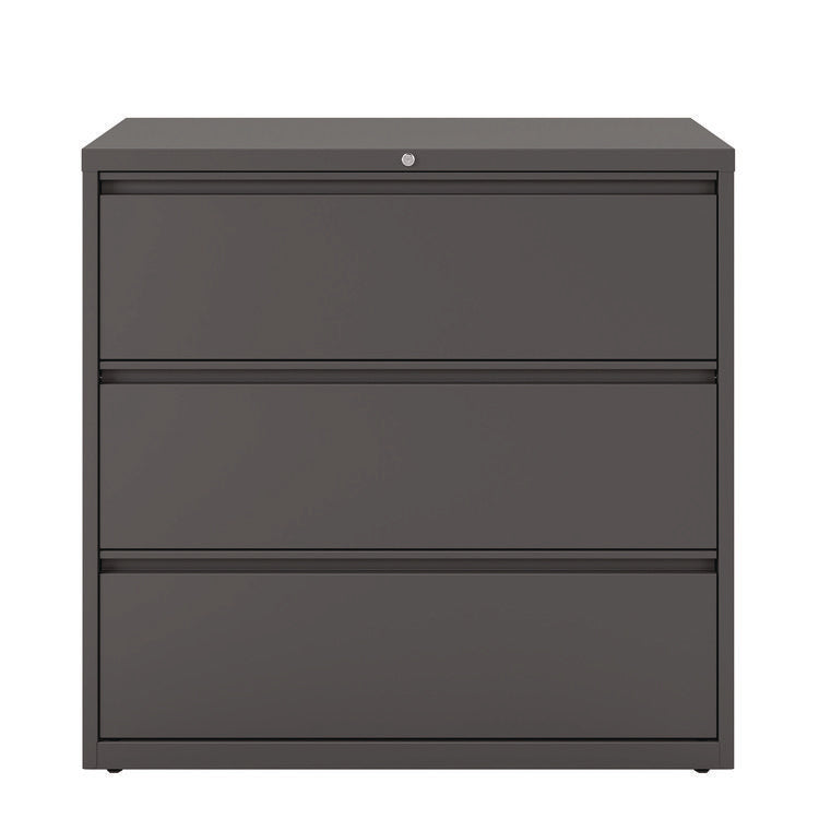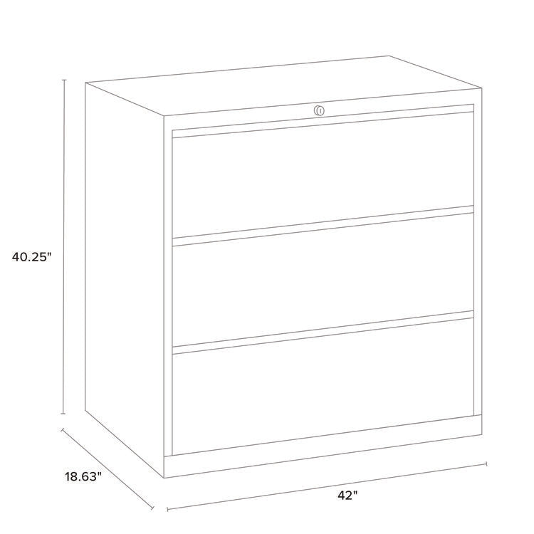 Drawers with side-to-side hang rails to accommodate letter/legal hanging files. Full drawer extension on steel ball bearing telescoping slide suspension helps drawers glide with ease. Stylish, full-width radius edge recessed pulls help to quickly open and close drawers. Anti-tipping interlock system allows only one drawer to open at a time. Single key core removable lock with two keys. Four adjustable leveling glides. Durable powder coated finish helps prevent scratches. Three Drawers. Number of Drawers: 3; Drawer Configuration: File; Anti-Tip Mechanism Indicator: Yes; Anti-Tip Mechanism: Counterweight; Interlocking Drawers.