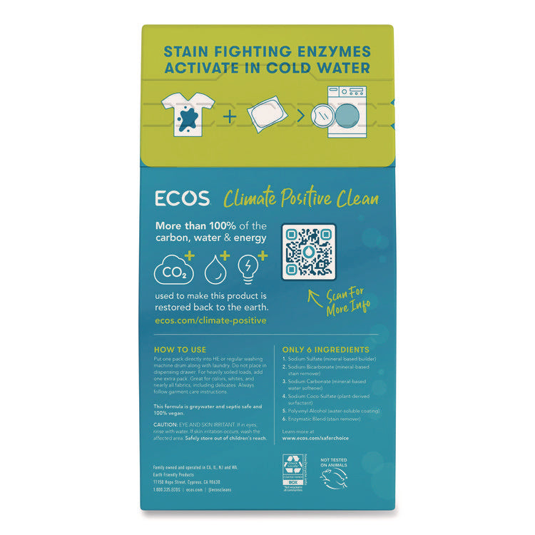 Redefining convenience, these sustainable, all-in-one laundry packs make washing a breeze. Our advanced, plant-powered formula harnesses the natural cleaning power of enzymes, which penetrate deep into fabric fibers to break down and eliminate stubborn stains, ensuring a thorough and effective clean with every wash. Say goodbye to sticky spills and hoisting heavy jugs, and elevate your laundry experience with ECOS the sustainable, convenient, and highly effective solution you've been searching for! Works well with all washing machines, temperatures, and cycles. 100% plastic free packaging reduces plastic waste, contributing to a sustainable future. Not tested on animals. Manufactured in a facility that is LEED Zero Carbon, LEED Zero Waste, and LEED Zero Energy Certified. Application: Laundry Detergent; Applicable Material: All Washable Fabrics; Chemical Compound: Sodium Sulfate; Sodium Carbonate; Sodium Bicarbonate; Sodium Coco-Sulfate; Polyvinyl Alcohol; Protease; Lipase; Amylase; Dirt Types: Dirt; Stains.