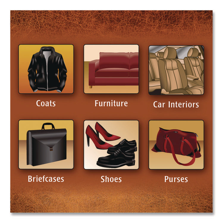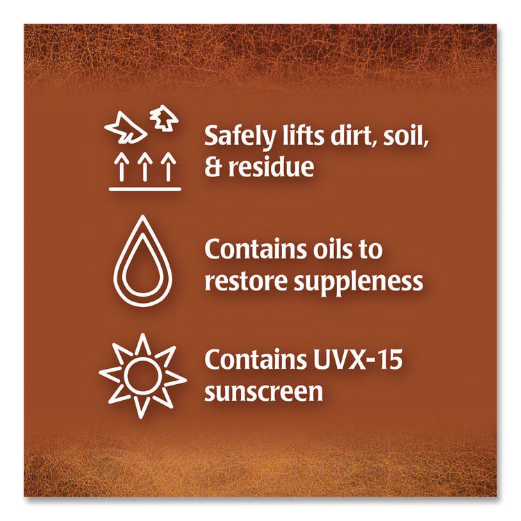 Multi-action formula cleans, moisturizes and protects leather. Sunscreen prevents leather from drying, cracking, and fading. Natural oils condition and instantly revitalize leather, restoring is suppleness and sheen. Safely removes dirt, soil and residue. Recommended for smooth, finished leather surfaces including furniture, car interiors, shoes and boots, briefcases, handbags, jackets and luggage. Application: Leather/Rubber/Vinyl Treatment; Applicable Material: Leather; Dirt Types: Dirt; Residue; Soil; Scent: Floral.