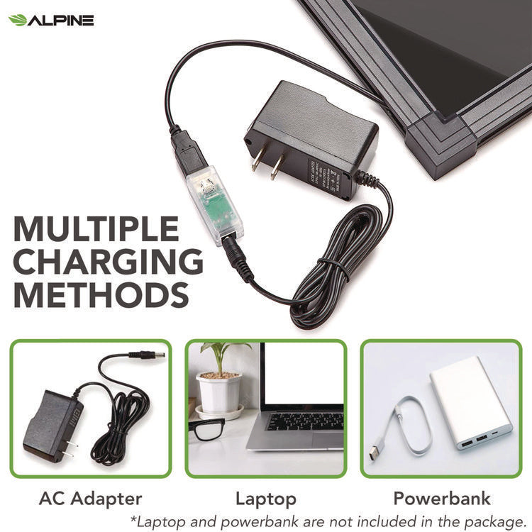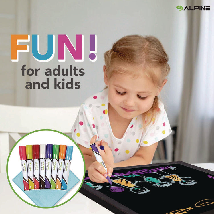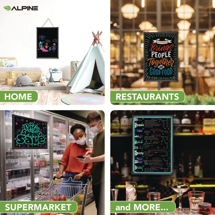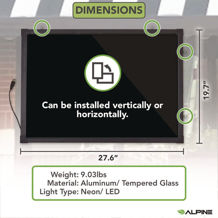 The Alpine Industries LED Illuminated Hanging Message Writing Board features a glowing neon notice sign with 48 different flashing display styles. With a main panel made of high-quality tempered glass fitted in a durable aluminum frame, this LED writing board meant for outdoor restaurant or venue advertising. Just attach to chain, hang on your wall, plug in, and use the adaptor remote button to maneuver between flashing functions. Guide customers towards your promotional pricing or upcoming events using eight colored marker pens. Prior to use, please shake markers while capped to keep from damaging clothing. Keep capped until ready for use. Also includes hanging chain, power adapter, remote control, erasing towel and User Manual. Face Color(s): Black; Frame Color: Black; Message(s): Customizable; Material(s): Aluminum.
