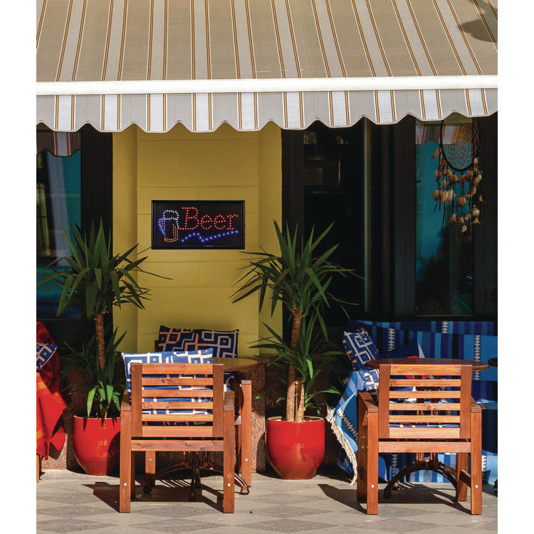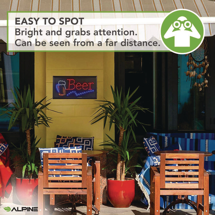 With Alpine Industries LED Signs to outshine your competitors, your improved visibility will see your business flourish and succeed. Our LED lights are bright, safe, and energy efficient when compared to traditional neon signs, and also user friendly. Give your business a boost with a bright, noticeable new Beer sign that will attract new customers and keep them coming back. Includes a hanging chain to easily display at your place of business. The Alpine Industries LED Beer sign is UL Certified and plugs in to any outlet. This sign is simple to use with the on and off switch on the side of the frame. It also features two display modes, flickering and animated, with a switch on the power cord. Frame Color: Black; Size: 19 x 10; Message(s): Beer; Material(s): Aluminum.