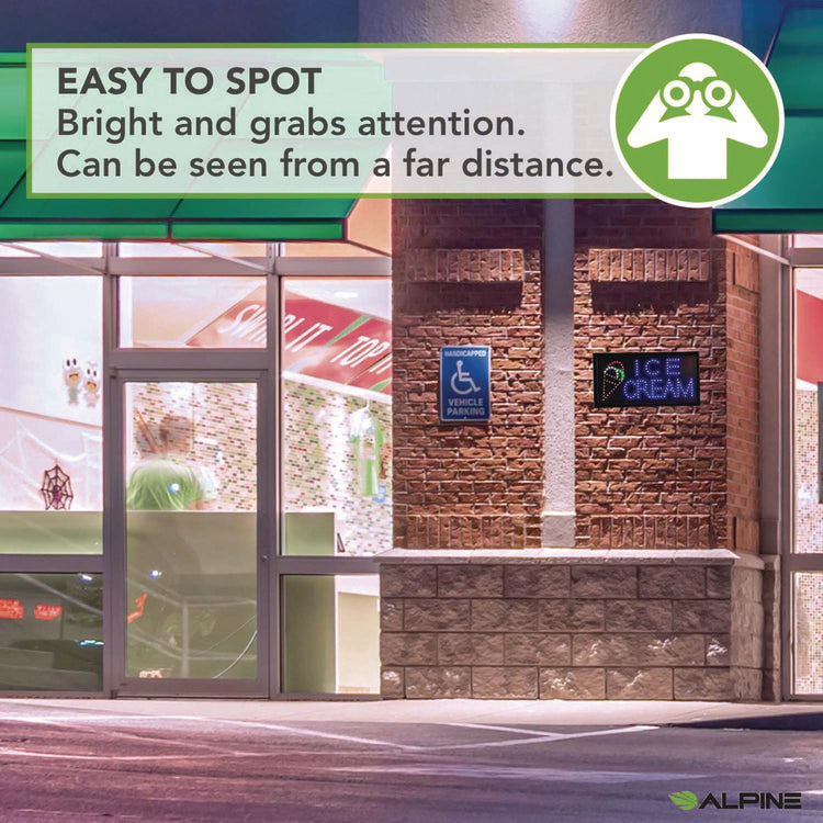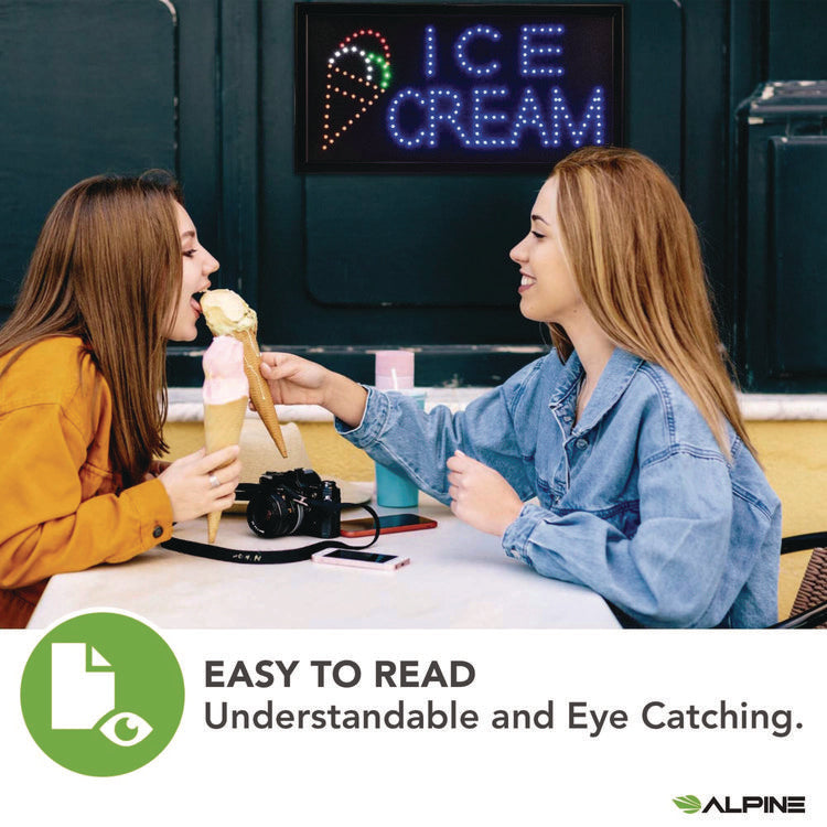 With Alpine Industries LED Signs to outshine your competitors, your improved visibility will see your business flourish and succeed. Our LED lights are bright, safe, and energy efficient when compared to traditional neon signs, and also user friendly. Give your business a boost with a bright, noticeable new Ice Cream sign that will attract new customers and keep them coming back. Includes a hanging chain to easily display at your place of business. The Alpine Industries LED Ice Cream sign is UL Certified and plugs in to any outlet. This sign is simple to use with the on and off switch on the side of the frame. It also features two display modes, flickering and animated, with a switch on the power cord. Frame Color: Black; Size: 19 x 10; Message(s): Ice Cream; Material(s): Aluminum.