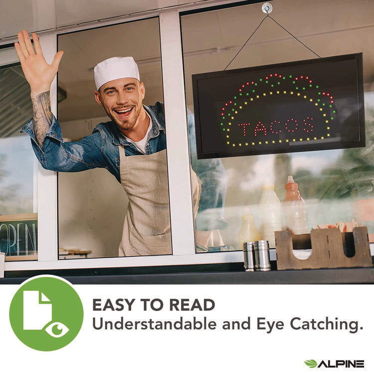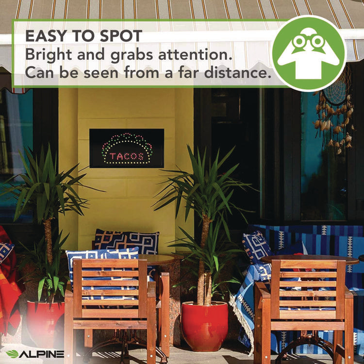 With Alpine Industries LED Signs to outshine your competitors, your improved visibility will see your business flourish and succeed. Our LED lights are bright, safe, and energy efficient when compared to traditional neon signs, and also user friendly. Give your business a boost with a bright, noticeable new Taco sign that will attract new customers and keep them coming back. Includes a hanging chain to easily display at your place of business. The Alpine Industries LED Taco sign is UL Certified and plugs in to any outlet. This sign is simple to use with the on and off switch on the side of the frame. It also features two display modes, flickering and animated, with a switch on the power cord. Frame Color: Black; Size: 19 x 10; Message(s): Taco; Material(s): Aluminum.