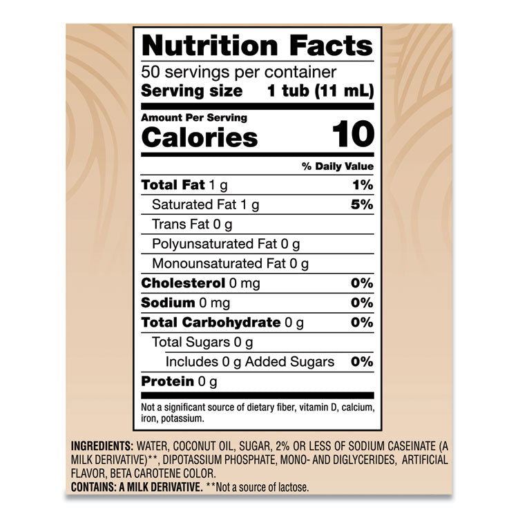 Delight your employees, customers and guests by offering liquid creamer in your workplace, breakroom or kitchen. Lactose-free, cholesterol-free, Kosher dairy and shelf-stable. Flavor: Original; Product Packaging: Mini Cups; Premeasured: Yes; Volume Capacity: 0.38 oz.