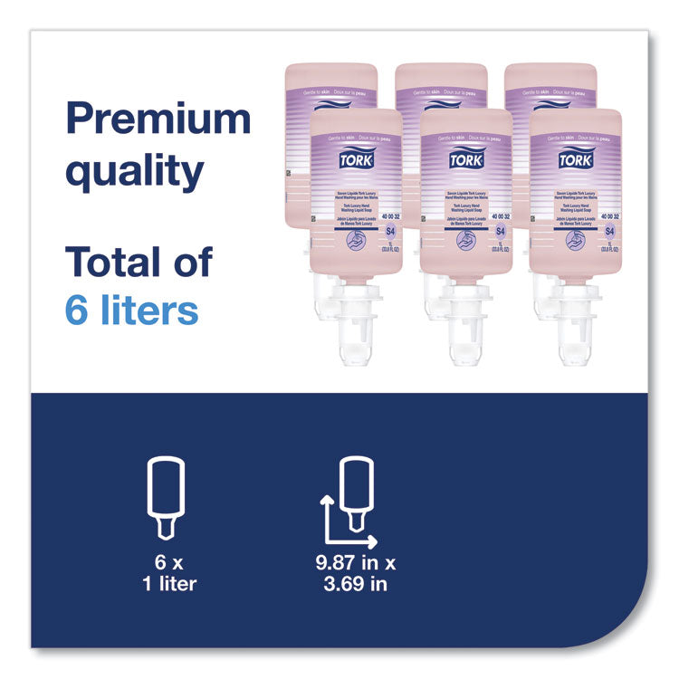 Tork® Luxury Hand Washing Liquid Soap features moisturizing ingredients and a pleasant fragrance. With a pearlescent sheen and a luxurious feel, this formula is gentle to skin and suitable for frequent use. This dermatologically tested formula is gentle to skin and suitable for frequent use. Easy to use and provide good hand hygiene to all users. Soap Type: Liquid; Volume Capacity: 1 L; Scent: Soft Rose; Personal Soaps Application: Hand.