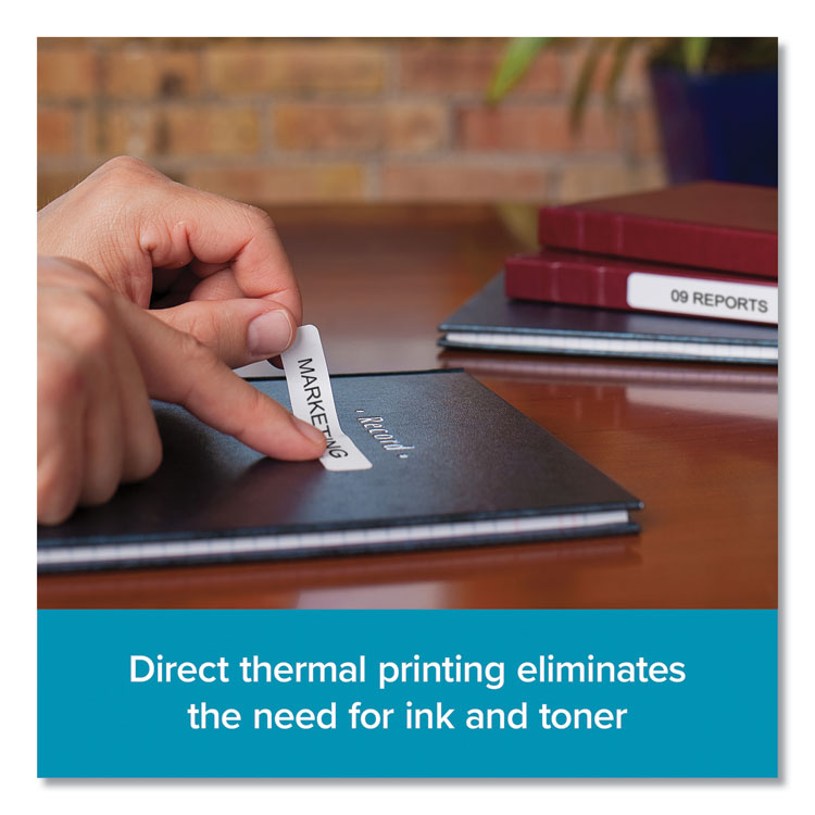 Quickly create file folder labels directly from your DYMO LabelWriter label maker with these 1-Up labels. Using a direct thermal printing process, you avoid the hassle of expensive ink or toner. Packaged in rolls, so you can print one shipping label or hundreds with ease. No more messy sheets, waste or sheet label jams. Label Size - text: 0.56" x 3.43"; Label Color(s): White; Machine Compatibility: DYMO LabelWriter 450, 450 Duo, 450 Turbo, 450 Twin Turbo, 4XL, SE450; Material(s): Plastic.