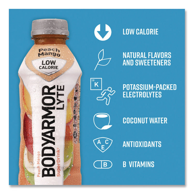 BodyArmor is a premium sports drink that provides superior hydration. It is packed with electrolytes, coconut water, and vitamins and is low in sodium and high in potassium. Beverage Type: Flavored Sports Drink; Flavor: Peach Mango; Product Packaging: Bottle; Volume Capacity: 16 oz.