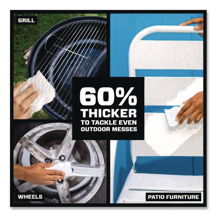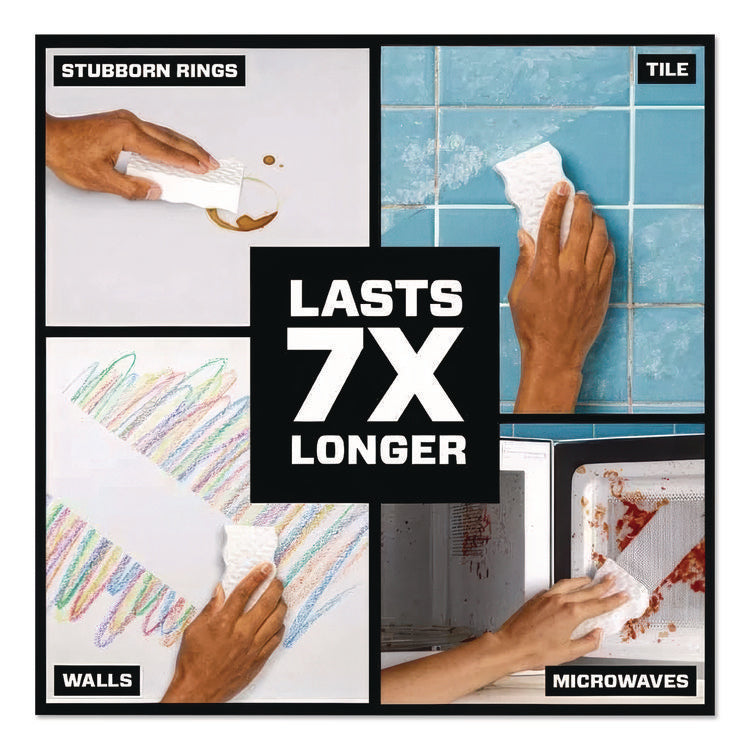 The Mr. Clean Magic Eraser Ultra Thick multi-surface cleaner lasts seven times longer than the Original Magic Eraser: no more sponges or other cleaning products needed. Just wet, squeeze, and erase over 150 messes with ease. The heavy-duty cleaning micro-scrubbers reach deep into surface grooves, lifting away built-up dirt and grime. The Magic Eraser Ultra Thick is an all-purpose cleaner that tackles tough messes all over your house, inside and out. Use it as a bathroom cleaner on soap scum, tub rings, and water spots. Use it in your kitchen on permanent marker stains, greasy counters, and grimy stovetops. Use it outdoors on grill grates and patio furniture. Also makes a great shoe cleaner and wall cleaner. Add the Magic Eraser Ultra Thick cleaner to your arsenal of cleaning supplies today. Sponge Type: Scrub Sponge; Material(s): Foam; Shape: Rectangle; Color(s): White.