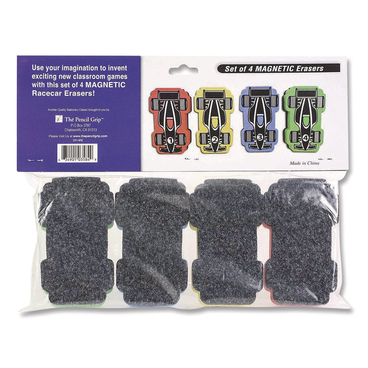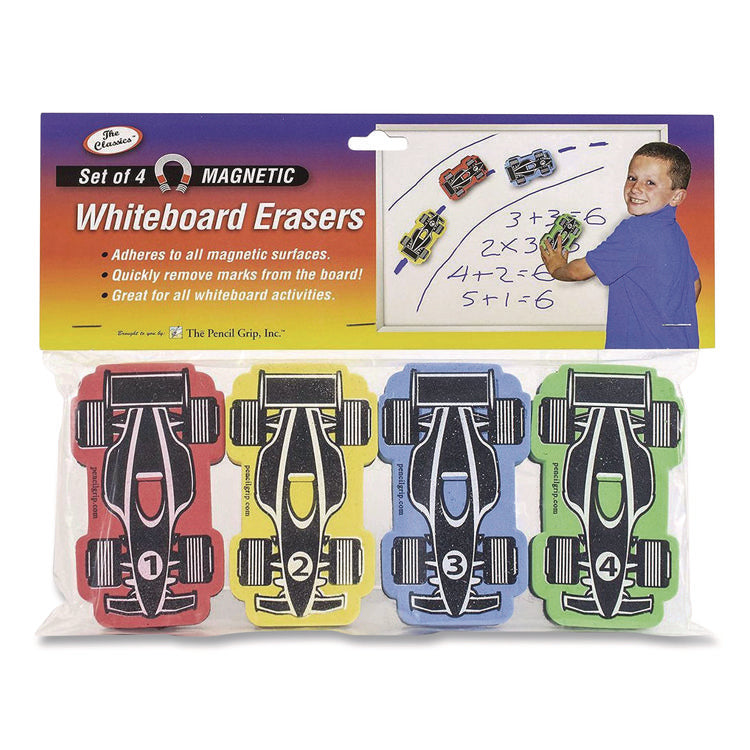 The Pencil Grip®'s whiteboard eraser comes in a race car mold for fun board activities. Magnetic and adheres to any magnetic surface with ease. Leave it up on your whiteboard, kids will zoom through language and math lessons when these cars are used as a part of the activity. This dry eraser can be used in classrooms, offices or at home. It is perfect for medium to large whiteboards. Board Eraser Application: All Dry Erase; Eraser Pad Material: Foam; Eraser Width: 4.5"; Eraser Depth: 2.6".