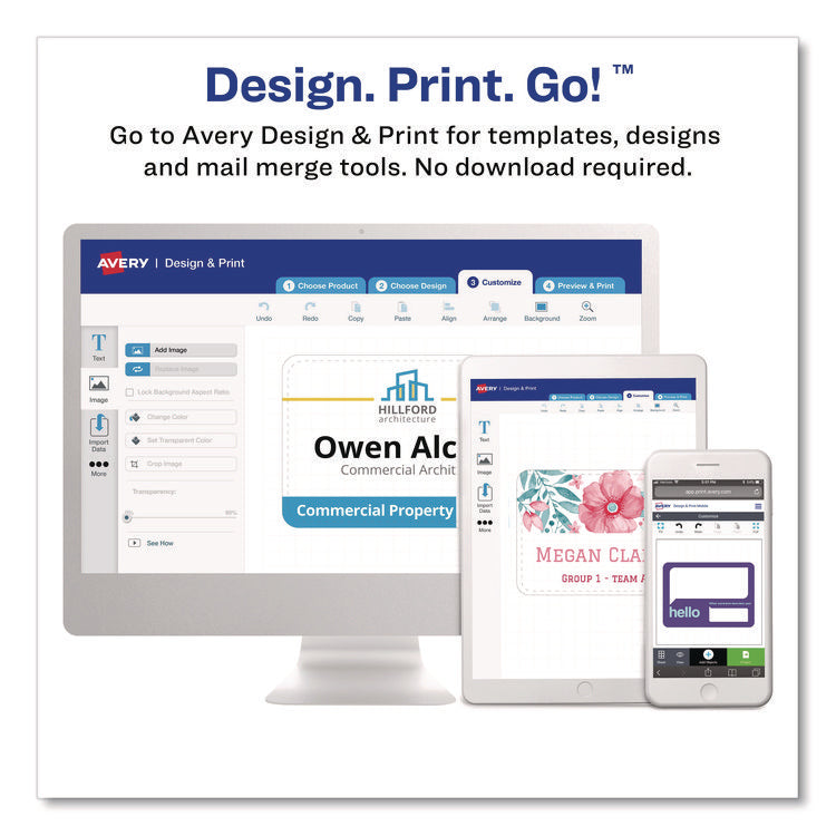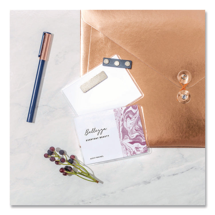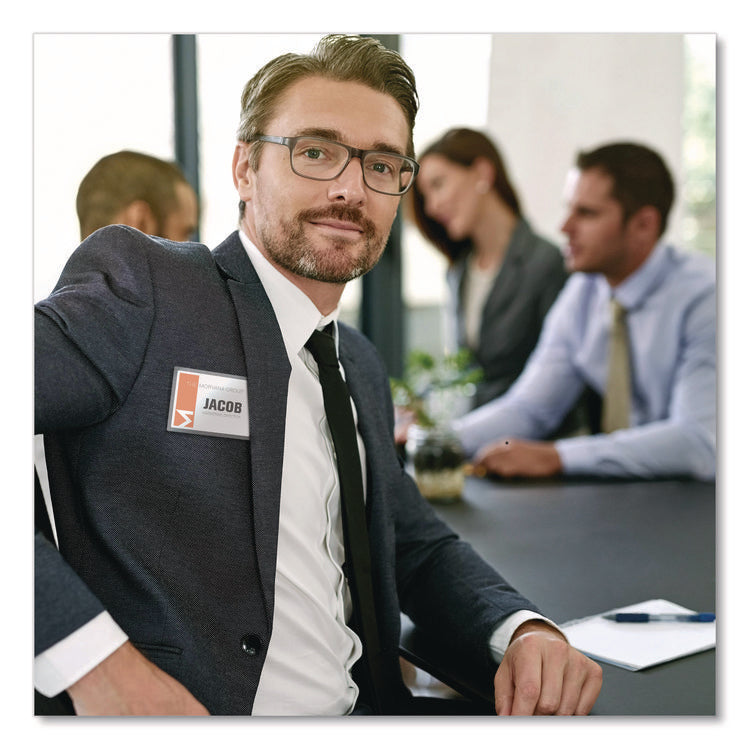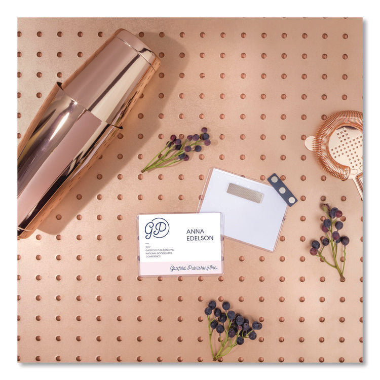 Strong, heavy-duty magnet holds name badge in place. Safe for any style of clothing without damaging material or flipping over. Features an easy-to-load pocket style design. Durable plastic is reusable and displays names clearly. Micro-perforated inserts separate cleanly, leaving smooth edges. Easy to customize with free designs and templates using Avery® Design & Print. 8.5 x 11 sheets for laser and inkjet printers. Orientation: Horizontal; Name Badge Holder Length: 3"; Name Badge Holder Width: 4"; Name Badge Holder Color(s): Clear.