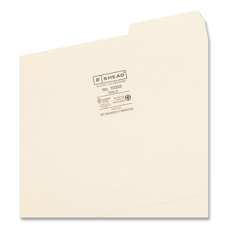 Elevate your document organization effortlessly with Smead File Folders. Enjoy quick access to your files, maintaining a tidy setup with this set of expandable file folders in classic manila color. Streamline your filing process, save time, and bring order to your space. Ideal for home, office, or classroom use. Folders contain recycled content. Choose Smead for efficient, reliable, and sustainable document organization—over a century of heritage, craftsmanship, and innovation. File Folder Size Type: Letter; File Folder Color: Manila; Color Family: Manila; File Folder Material: 11-pt Manila.