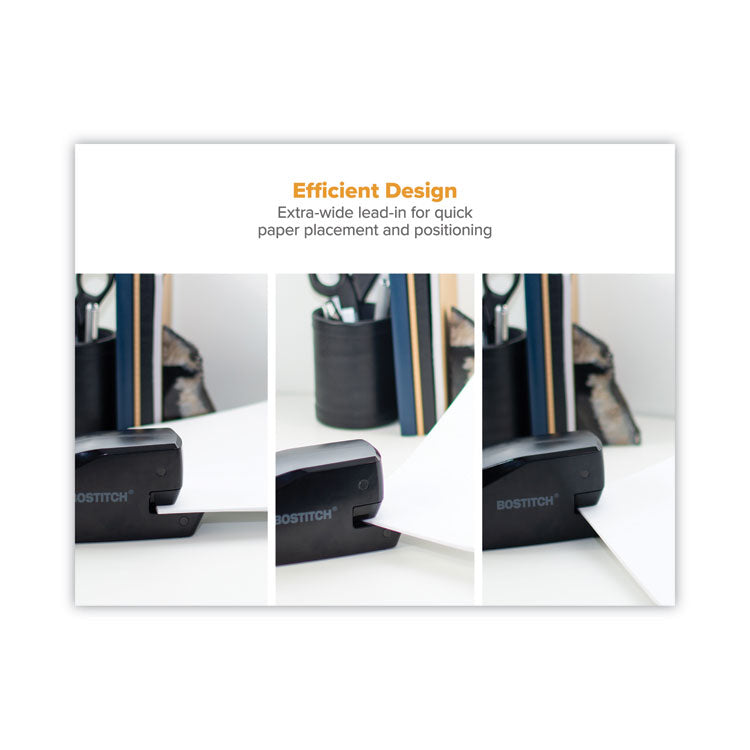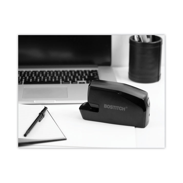 A sleek design engineered for reliable, everyday performance, the durable electric stapler can be powered by AC adapter or wire-free AA batteries for stapling of 2 to 20 sheets. Depending on setting, choose between an AC adapter for standard desktop use, or four AA batteries for on-the-go travel use (batteries not included). Motorized design delivers quiet operation while the extra wide paper lead-in allows for quick positioning, stapling at a 45-degree or 90-degree angle. The FastLoad™ push-button system makes reloading staples incredibly easy. Non-skid rubber base protects desktop surfaces and provides extra stability. For best results, use with Bostitch Premium Standard Staples High Capacity Stapling: No; Flat Clinch Plate: No; Tacking: No; Staple Capacity: Half Strip (105 Staples).