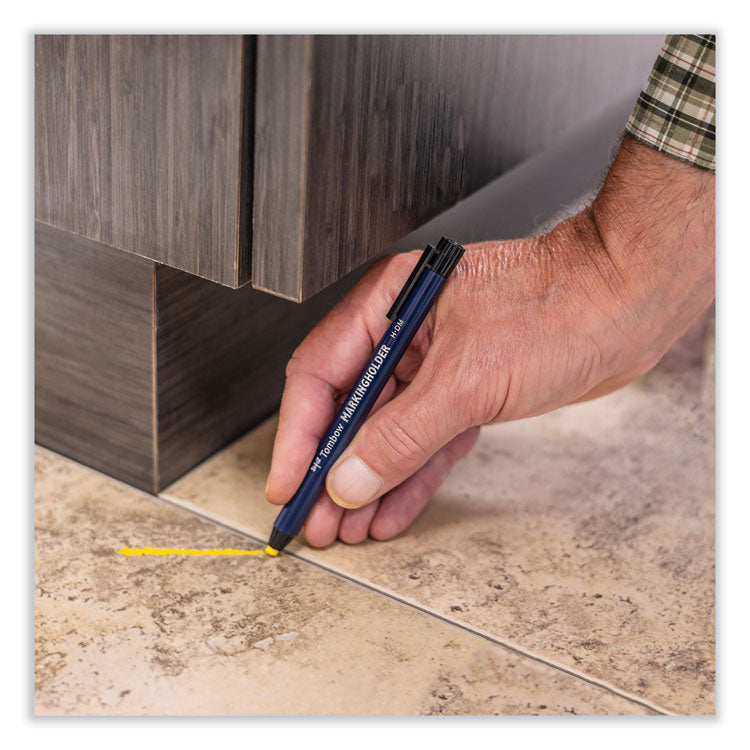 Versatile wax-based marking pencil refills ensure smooth, legible writing on a variety of surfaces. Use on both porous and non-porous surfaces, such as ceramics, stone, wood, glass, rubber, plastic, textiles, metal, coated paper, cardboard and more. Wax-based medium is water-resistant and works great on both dark and transparent surfaces. Easily erase from non-porous surfaces by wiping with a damp cloth. No sharpening required-perfect for craftsmen and professional use in industrial environments. Compatible with Tombow® Mechanical Wax-Based Marking Pencils. Lead Diameter: 4.4 mm; Lead Color: Yellow; Includes Erasers (Yes/No): No; Lead Refill Compatibility: Tombow® Mechanical Wax-Based Marking Pencils.