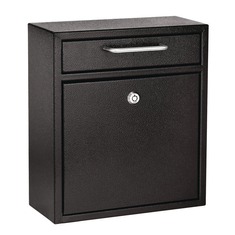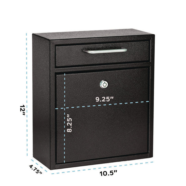 AdirOffice Locking Drop Box Wall Mounted Mailbox is designed to hold keys, cash, envelopes or other important materials that need to be dropped off after hours. Constructed of durable, heavy duty 16-gauge galvanized steel to provide long-lasting strength and furnished using a powder-coated, scratch-resistant finish, this mailbox is made to meet your needs year after year. Ideal for retail stores, military bases, rental facilities, customer service counters, manufacturing plants, auto dealers and other facilities, this secure drop box features an anti-fishing bin door that accepts letters, checks, keys and other small bundles. To prevent theft, an anti-pry latch locking mechanism is used. The locking access door features a commercial grade lock and includes three laser cut keys to ensure the items inside are safe and secure. To finish it off, this mailbox includes four mounting screws, four stainless steel washers, a driver bit and a drill bit for quick and easy installation of the box wherever you'd like to mount it. Material(s): Stainless Steel 304; Depth: 4.5"; Height: 12"; Width: 10.4".