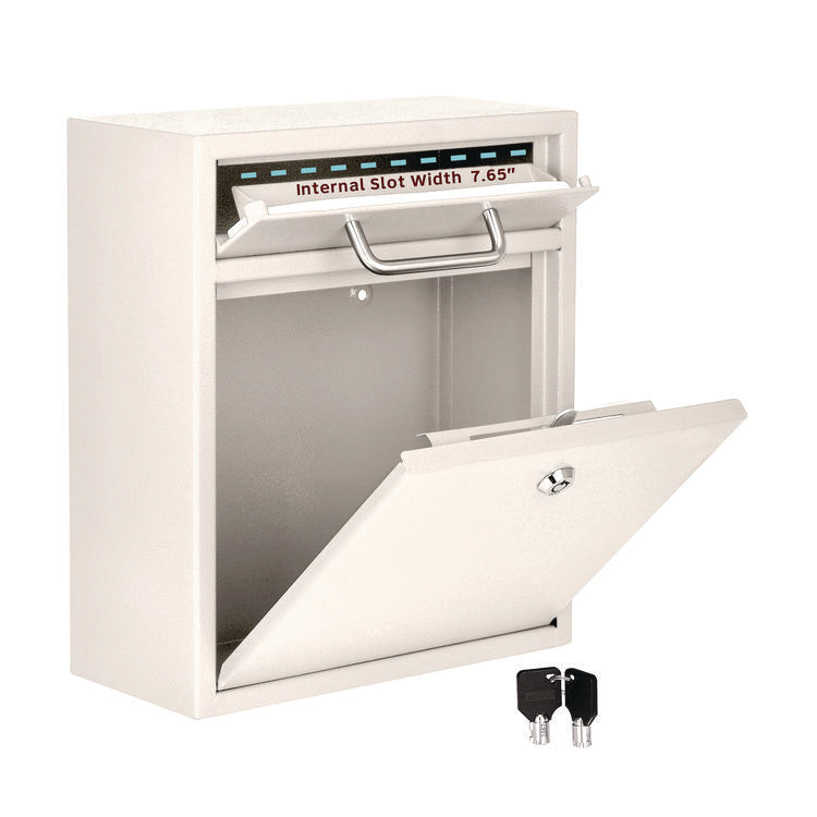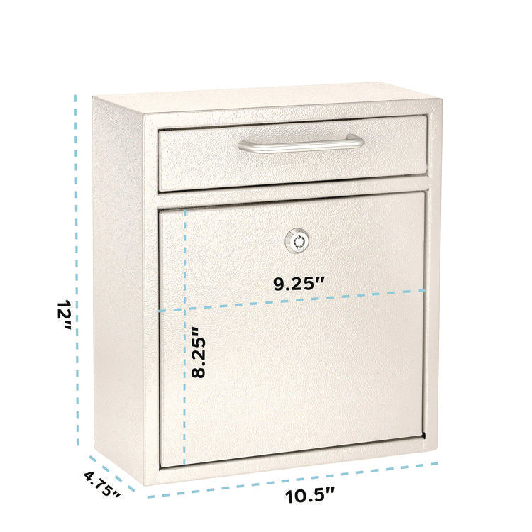 AdirOffice Locking Drop Box Wall Mounted Mailbox is designed to hold keys, cash, envelopes or other important materials that need to be dropped off after hours. Constructed of durable, heavy duty 16-gauge galvanized steel to provide long-lasting strength and furnished using a powder-coated, scratch-resistant finish, this mailbox is made to meet your needs year after year. Ideal for retail stores, military bases, rental facilities, customer service counters, manufacturing plants, auto dealers and other facilities, this secure drop box features an anti-fishing bin door that accepts letters, checks, keys and other small bundles. To prevent theft, an anti-pry latch locking mechanism is used. The locking access door features a commercial grade lock and includes three laser cut keys to ensure the items inside are safe and secure. To finish it off, this mailbox includes four mounting screws, four stainless steel washers, a driver bit and a drill bit for quick and easy installation of the box wherever you'd like to mount it. Material(s): Stainless Steel 304; Depth: 4.5"; Height: 12"; Width: 10.4".