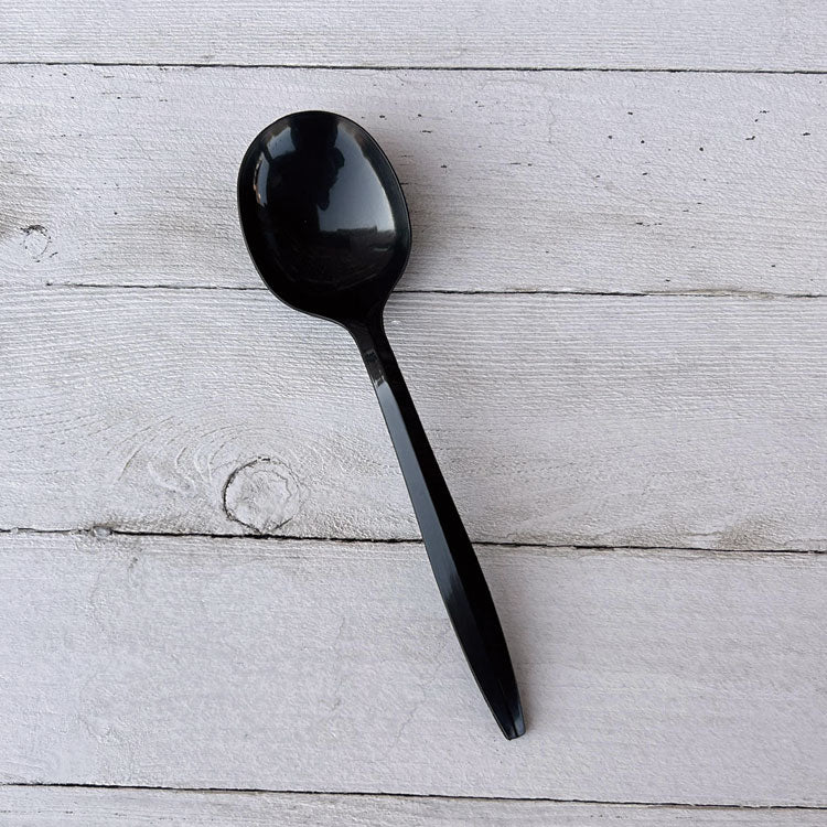This mediumweight cutlery provides a sturdy, rigid utensil, that's ideal for barbecues, birthday parties, casual restaurants, offices, schools, cafeterias, events, and other culinary gatherings. Get the convenience of plastic cutlery, without the inconvenience of flimsy, lightweight products that break upon use. The simple, classic design and neutral colors fit seamlessly into any event decor. Polybagged for easy stocking and distributing to guests. Utensils Type: Soup Spoon; Material Type: Plastic; Material(s): Plastic; Color(s): Black.