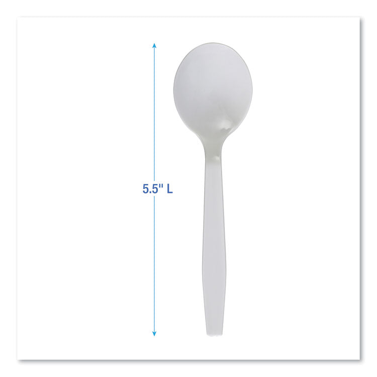This polystyrene cutlery provides a sturdy, rigid utensil, that's ideal for barbecues, birthday parties, casual restaurants, offices, schools, cafeterias, events, and other culinary gatherings. Get the convenience of plastic cutlery, without the inconvenience of flimsy, lightweight products that break upon use. The simple, classic design and neutral colors fit seamlessly into any event decor. Polybagged for easy stocking and distributing to guests. Utensils Type: Soup Spoon; Material Type: Plastic; Material(s): Polystyrene; Color(s): White.