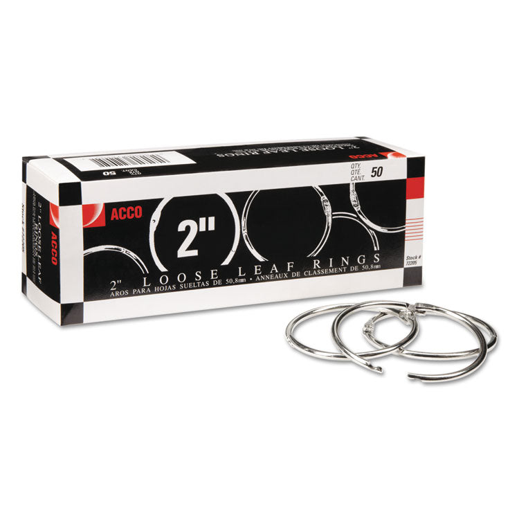 Loose-leaf rings made with multi-layer nickel-plated steel will not crack or split. Rings open and close easily and lock for extra security. Ring Size: 2"; Ring Material(s): Nickel-Plated Steel; Quantity: 50/Box.