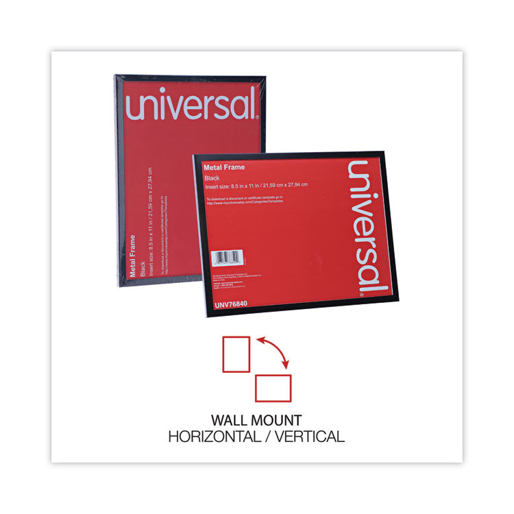This contemporary metal frame will compliment any décor. Constructed of aluminum, this simple frame fits 8.5" x 11" documents, digital photos, diplomas and achievements. Clear glass face with beautiful velvet backing. Easel back allows frames to be displayed on desk or hung on the walls with pre-drilled hanging hardware. Type of Frame: Photo; Frame Material: Aluminum; Frame Color: Black; Color Family: Black.