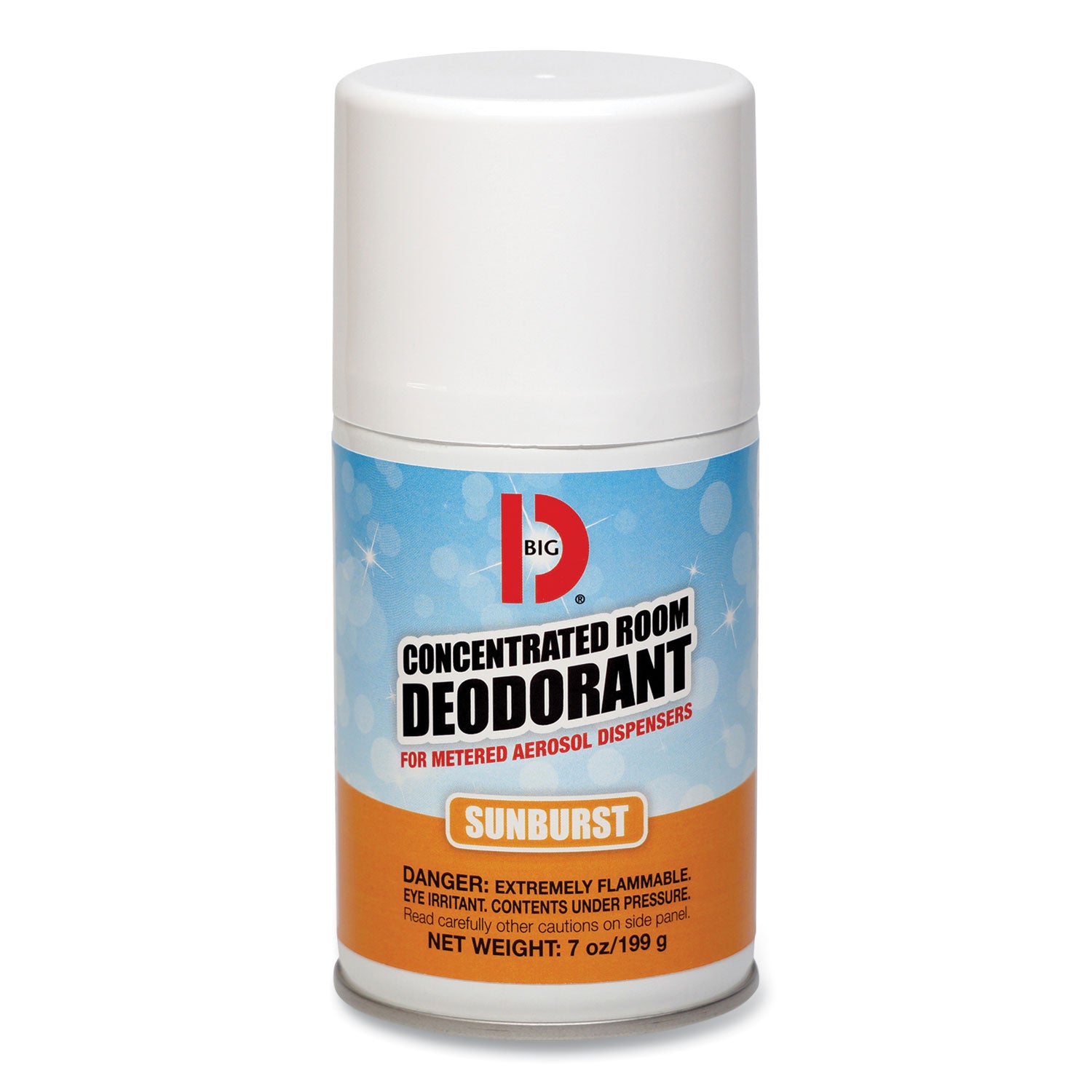 Eliminate odors instead of just masking them, with a concentrated deodorant and odor neutralizer. A uniform actuator valve allows this can to be used in most metered aerosol dispensers. A long lasting fresh scent ensures a pleasant environment. CONCENTRATED ROOM DEODORANT for Metered Aerosol Dispensers is a true BIG D odor counteractant specially formulated for industrial and institutional needs. The formula contains no 1-1-1 Trichloroethane or fluorocarbons. BIG D offers an assortment of pleasant fragrances containing our special deodorizers that neutralize odors rather than mask them. The uniform actuator valve enables the aerosol canister to be used in BIG D METERED AEROSOL DISPENSERS. Each 7 oz. can contains approximately 3,400 sprays and effectively deodorizes a 6,000 cu. ft. area. Scent: Sunburst; Physical Form: Aerosol; Application: Odor Control; Volume Capacity: 7 oz.