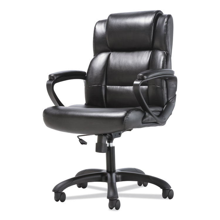 The office chair features luxurious sofThread leather for an upscale look and feel, making it a smart and stylish solution for any application. It offers simple and intuitive controls such as pneumatic seat height adjustment, 360-degree swivel, tilt tension and tilt lock for added customizability and comfort. The contemporary tapered arms add to the modern appeal. The comfort, stylish look, and price point of this chair make it a perfect addition to the office whether at work or at home. Recommended Application Area(s): Executive & Management; General Office & Task; Seat Color: Black; Back Color: Black; Color Family: Black.