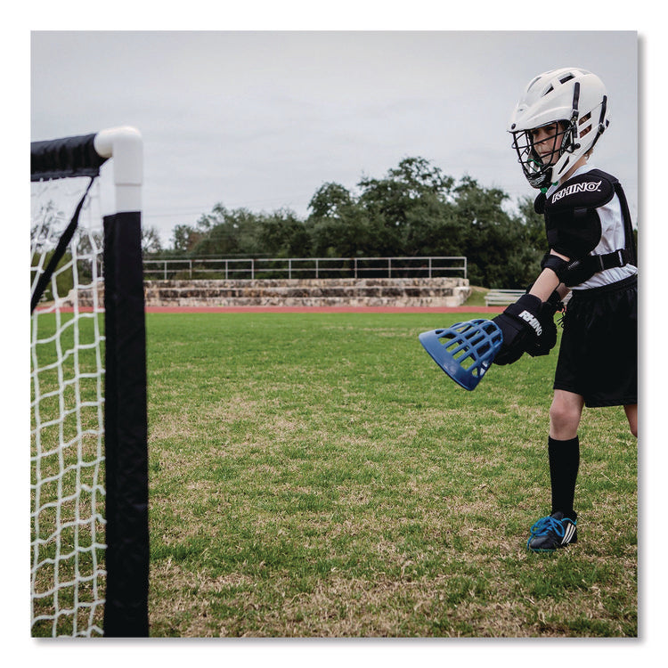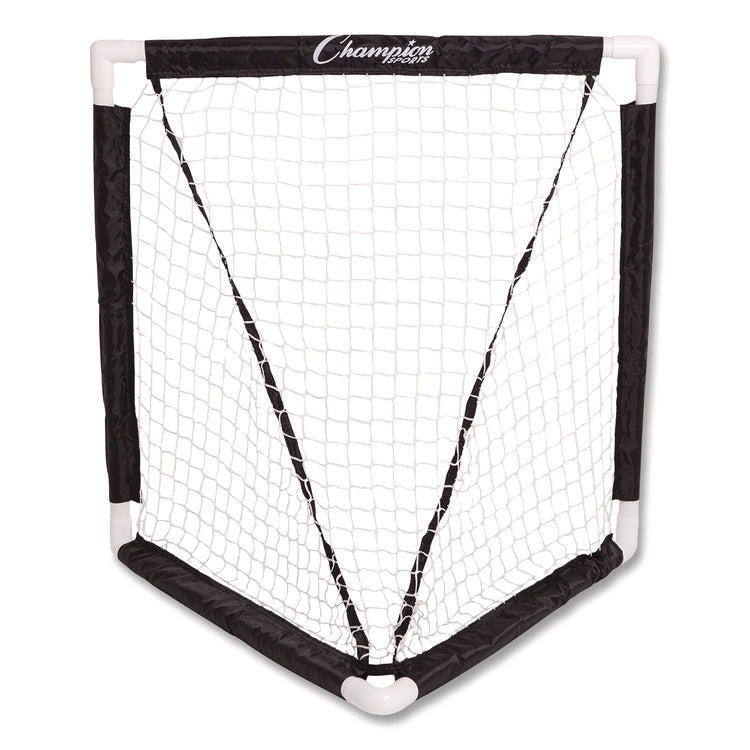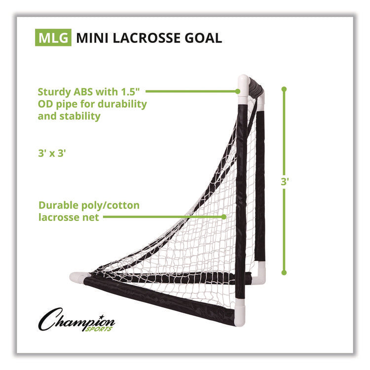 The Champion Sports Mini Lacrosse Goal is designed for younger players to practice their skills and learn to play the game anywhere. Made with sturdy polypropylene plastic and 1.5" OD pipe, this mini lacrosse goal is durable enough to withstand regular play, making it suitable for gym classes or leagues. With a weighted base, this mini lacrosse net is stable and sturdy on both gymnasium floors and outdoor playing surfaces. Length: 3 ft; Width: 3 ft; Diameter: 1.5"; Material(s): Plastic; Polyester Net.