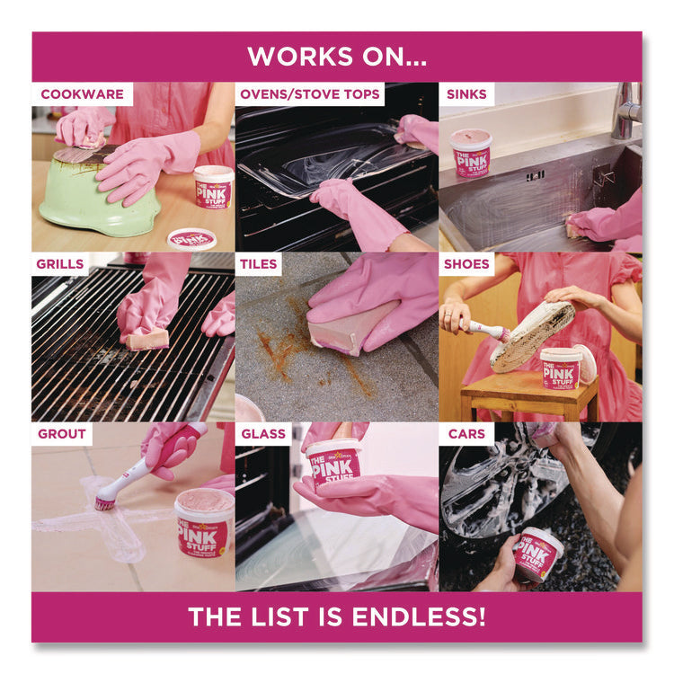 The Pink Stuff Miracle cleaning paste is perfect for cleaning dirt, grime, and stains on saucepans, cooker tops, sinks, uPVC, barbecues, ceramic tiles, glass, showers, garden furniture, paintwork, boats, and brass. The list is endless. A natural formulation has been developed to provide high performance without the need for harsh chemicals. Application: Degreaser/Cleaner; Applicable Material: Brass; Ceramic Tile; Glass; Metal; Painted Surfaces; Chemical Compound: Dye; Soap; Quartz; Sodium Silicate; Fragrance; Dirt Types: Grease; Grime; Limescale; Stains.