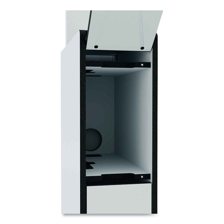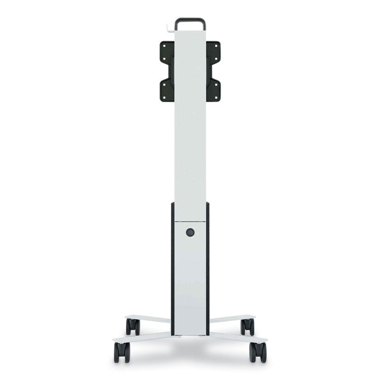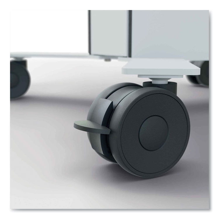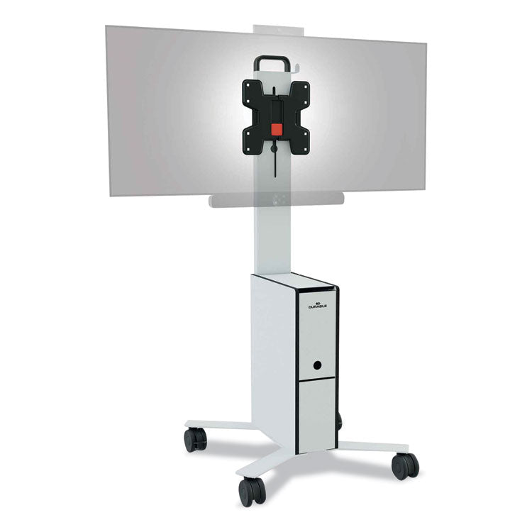 Host video conferences and presentations from anywhere with the COWORKSATION® Mobile TV/Monitor Cart from DURABLE®. With VESA mount compatibility spanning from 2.9" to 7.8," this versatile TV stand can accommodate monitors up to 65". Easily and securely transport your monitor and park it in place with the 2.95" casters, equipped with brakes. The integrated cable management system has multiple cable openings on the front, back and sides, allowing for optimal heat management, while also concealing cables for a clean and clutter-free workspace. The upper and lower storage compartments are tailored for small devices and accessories, such as mouse, keyboard, cables, power strip and remote control. This high-quality, German-designed mobile monitor cart is constructed with a robust steel frame and highly durable wood laminate, ensuring stability and protection for valuable equipment. Whether you want a mobile workstation, are engaging in video conferences or are leading presentations, the DURABLE COWORKSATION is your on-the-go mobile solution. Material(s): Compact Density Fiberboard (CDF); Overall Material Type: Engineered Wood; Color(s): White; Color Family: White.