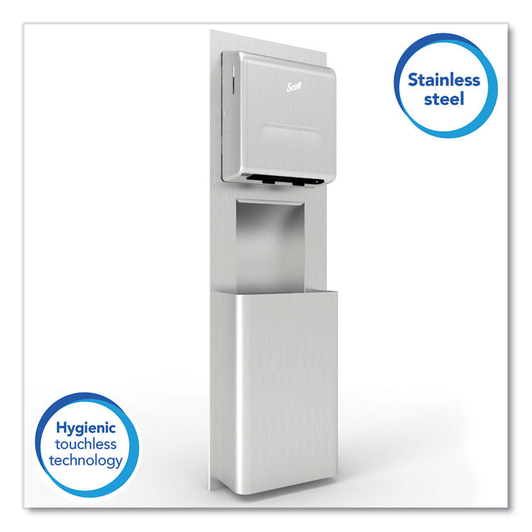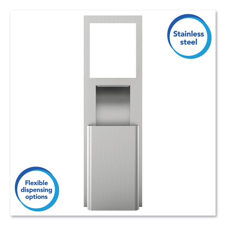 The MOD* stainless steel recessed wall Unit with trash receptacle is designed to provide a complete restroom solution when combined with either the 31501 or 31498 stainless steel dispensers (sold separately). With touchless technology and the bacteria-reducing benefits of drying with paper towels, the recessed unit with trash receptacle supports and promotes better hand and surface hygiene. MOD* Dispenser Systems are designed to give you the flexibility to build a dispenser customized to meet your requirements. Towels Dispensers Type: Recessed Wall Unit With Trash Receptacle; Material(s): Metal; Plastic; Color(s): Stainless Steel; Depth: 4.5".