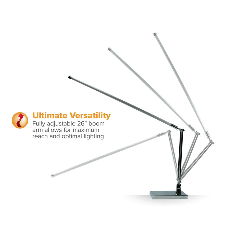 Looking for a desk lamp that stands out and stands tall? This LED clamp desk lamp features a 26 adjustable boom arm for fast and easy positioning of light. Adding to its versatility is the dual mount. Simply position this adjustable lamp on top of your desk or use the clamp mount for a more unique, set-up. Give your eyes a break even when you can't take one. This eye-catching lamp mimics natural daylight so you can bring the outdoors inside. Using 7 watts, this LED clamp desk lamp emits a 535 lumen output for ultimate brightness. Plus, the compact, chrome body saves much needed desk space and brings a modern touch to any environment. Avoid distracting shadows, halos and glares with the flicker-free, full-spectrum light zone so you can maintain productivity and focus. Plus, save money and energy with cost-efficient LED bulbs that use 85% less energy and last up to 50,000 hours. Base Color: Silver; Plug Type: 2 Prong; Height: 15.7"; Width: 7.9".