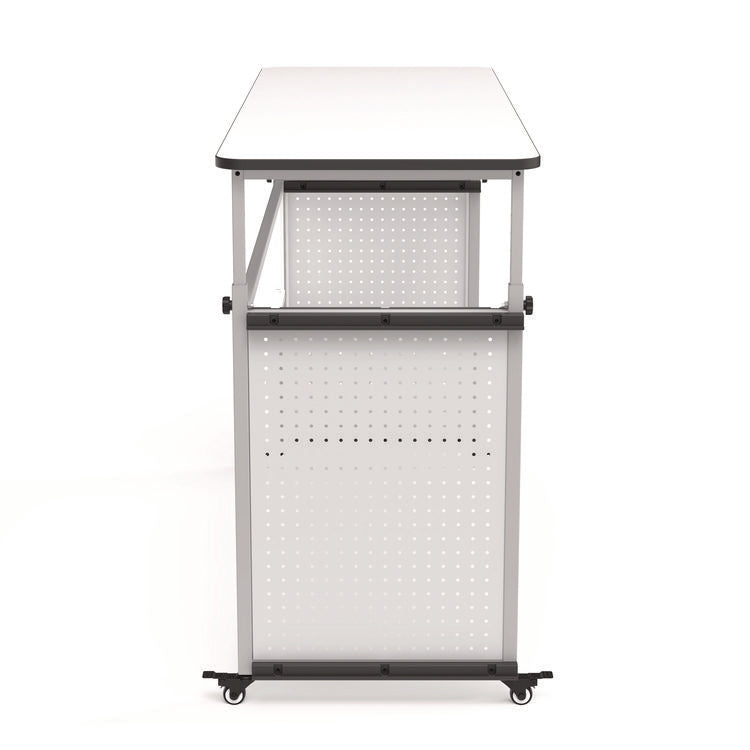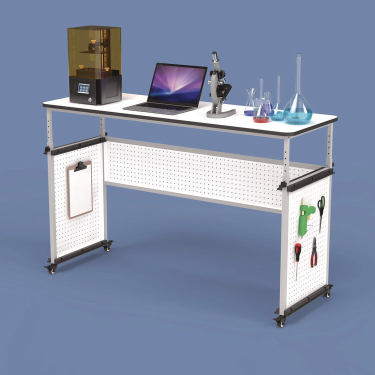 The teacher who stands in front of a chalkboard all day is a relic of the past. Today's educators lead engaging, hands-on activities where students learn by doing, making, and exploring the limits of their imaginations. Recognizing how much instruction has evolved, we created Luxor's Modular Teacher Desk to meet modern classroom needs. Designed primarily as a teacher table, it features a multipurpose design that also makes it an excellent choice as a science lab table or training table. Highlights include a chemical-resistant top, tool-free adjustable height, a modesty panel, and multiple built-in pegboards. Integrated connection rails, meanwhile, make it easy to connect compatible Luxor MBS-Series modular storage cabinets and bookshelves to create custom classroom solutions. Full-swivel, lockable casters provide easy mobility. Series Name: Luxor MBS Classroom; Worksurface/Base Color: White; Color Family: White; Worksurface Shape: Rectangular.