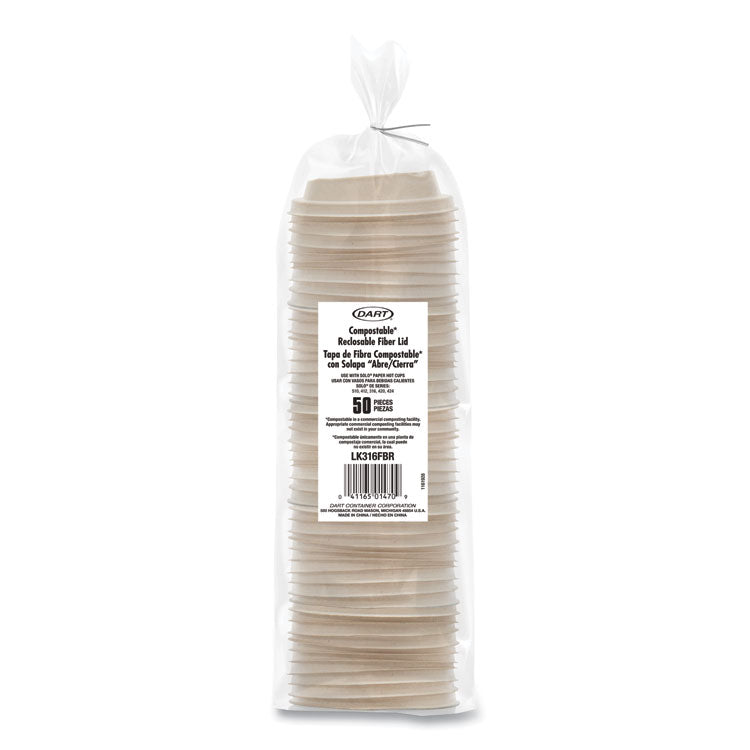 Pair with Dart® SSPLA cups for a commercially compostable lid and cup duo! Serve up classic cappuccinos, English teas and other hot drinks with this sustainable fiber lid. Simplify your inventory; this lid fits 10 oz to 24 oz cups and removes the need for plastic plug stir sticks! Minimize messes with the secure fit and sturdy shape of this lid. There's plenty of room for whipped cream and other toppings so you can turn a morning staple into a gourmet experience! Compostable in a commercial compost facility which may not exist in your community. Not suitable for backyard composting. ProPlanet SealThis product earns Dart's ProPlanet Seal because it meets ASTM requirements for commercial compostability. Fits: 10 oz to 24 oz Hot Cups; Material Type: Molded Fiber; Material(s): Fiber-Blend; Color(s): Tan.