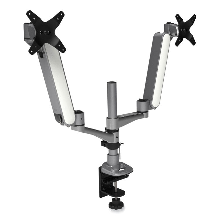 Multi-Directional Dual Monitor Arm, For 30" Monitors, 360 Deg Rotation, 105 Deg Tilt, 360 Deg Pan, Silver/WH, Supports 20 lbs